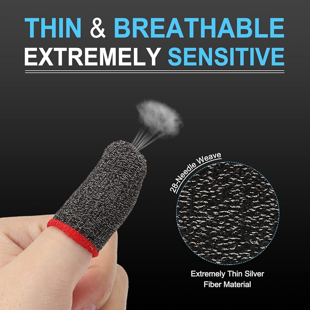 Extremely thin silver fiber material, 28-needle weave, ultra-fine, ultra-dense and ultra-thin, sensitive to touch, thin and breathable, and extremely sensitive mobile phone game finger cover, the mobile game controllers' finger sleeves are used to improve sensitivity including covering fingertips and fingers.