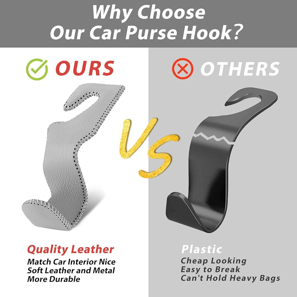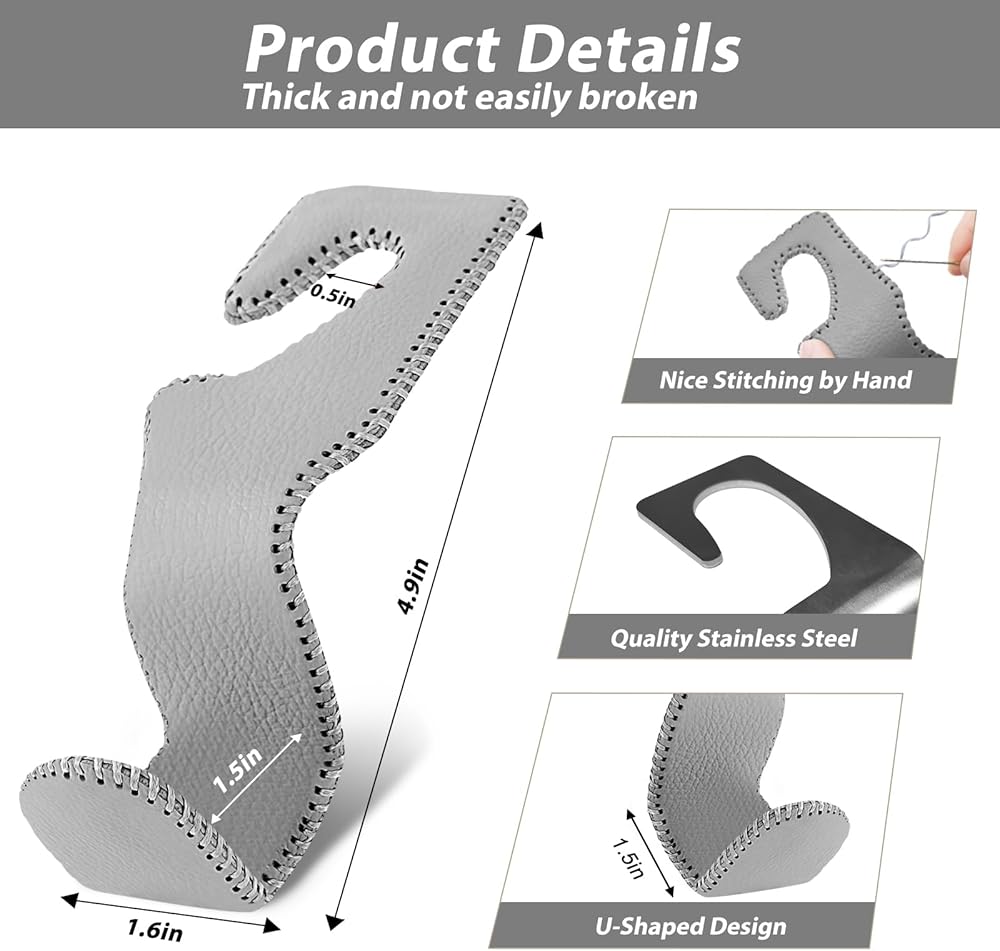 【High Quality Material】: These headrest hooks are made of durable stainless steel, covered by leather, flexible, strong, durable, which can hold up to 50 lb. It also match car's interior perfectly as well.