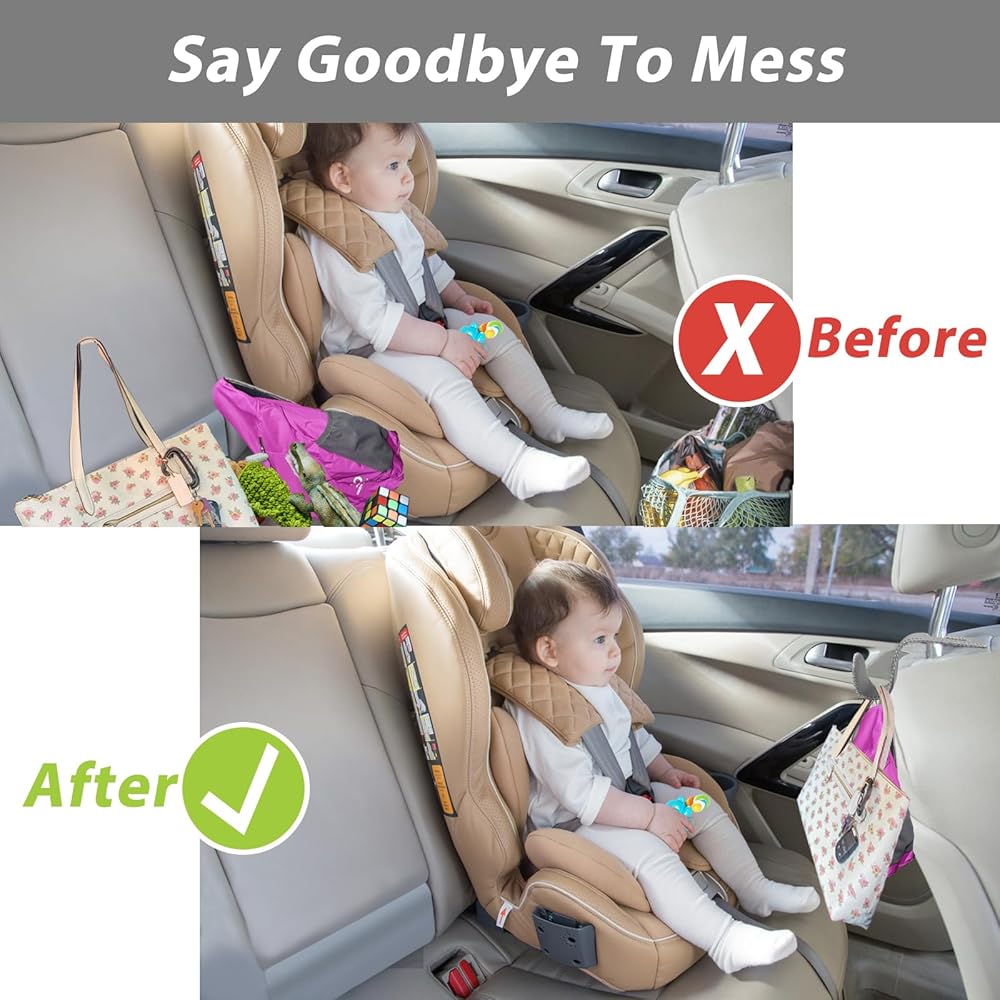 【Effective Space Saving】: Updated U-Shape purse hooks design, allow you to hang more thicker handled bags, protecting the strap of your bag from deformation to save more space for your car. The headrest hooks are great for hanging groceries, handbags, purses, schoolbags, umbrellas, water bottles, shopping bags, baby supplies and much more.