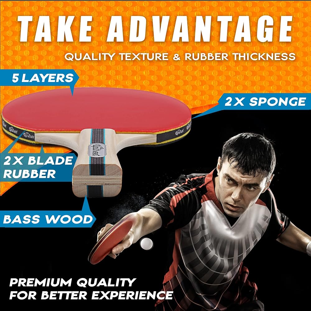 🏓 The Upstreet ping pong paddle set comes with ping pong balls and paddles which includes 10 tournament approved ping pong balls and 4 high-end table tennis paddles composed of seven layers of high quality wood and bouncy rubber with black stripes on the handle