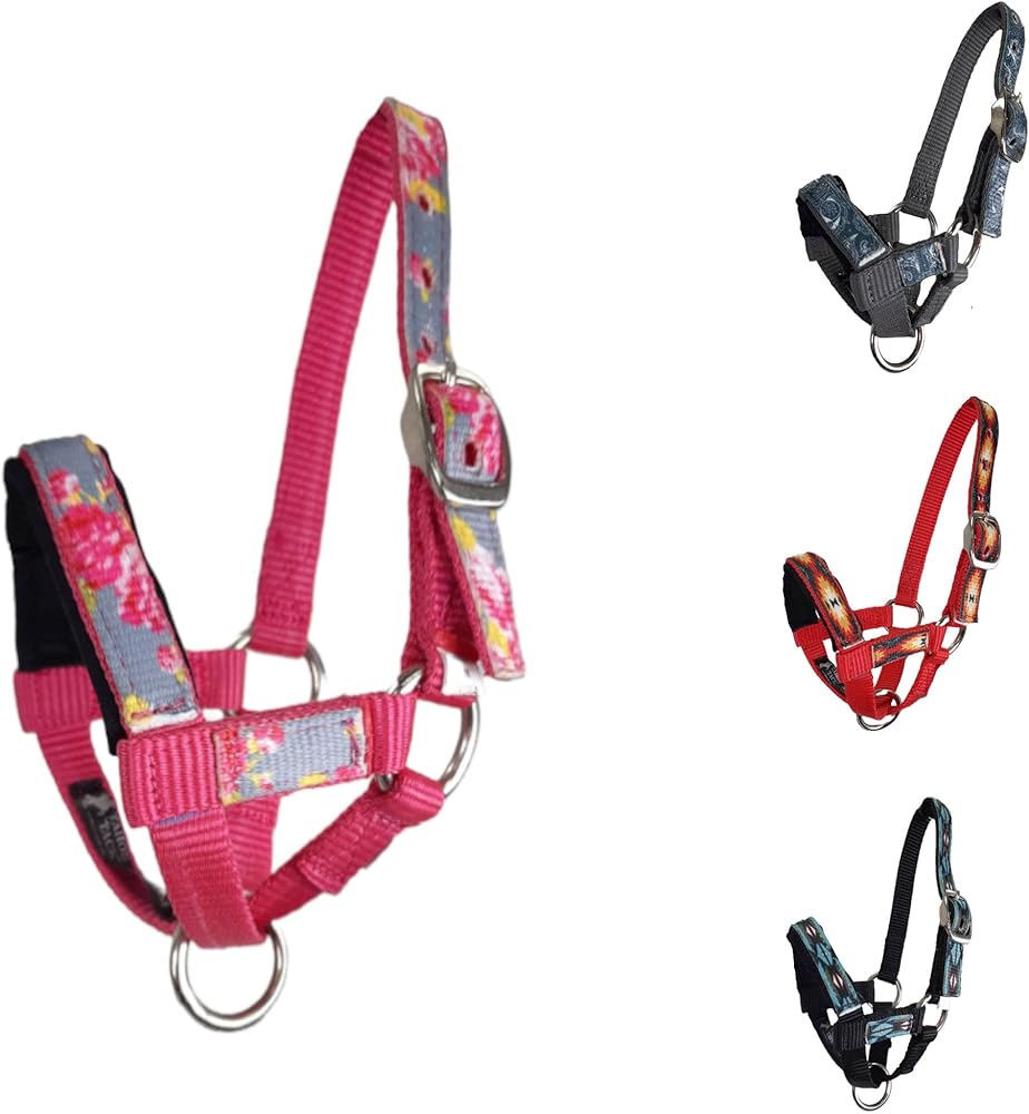 AVAILABLE IN 4 STUNNING PATTERNS - these premium halters are available in four options to best suit your taste: Blue Aztec print over Black nylon, Red Aztec print over Red nylon, Paisley print over Grey nylon, and Grey Floral over Hot Pink nylon.