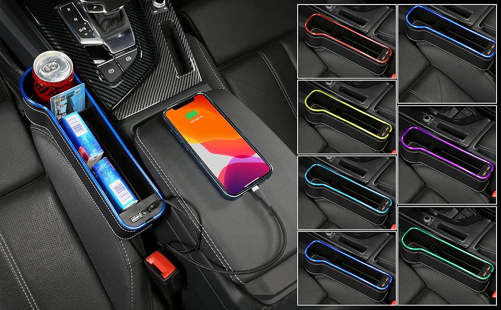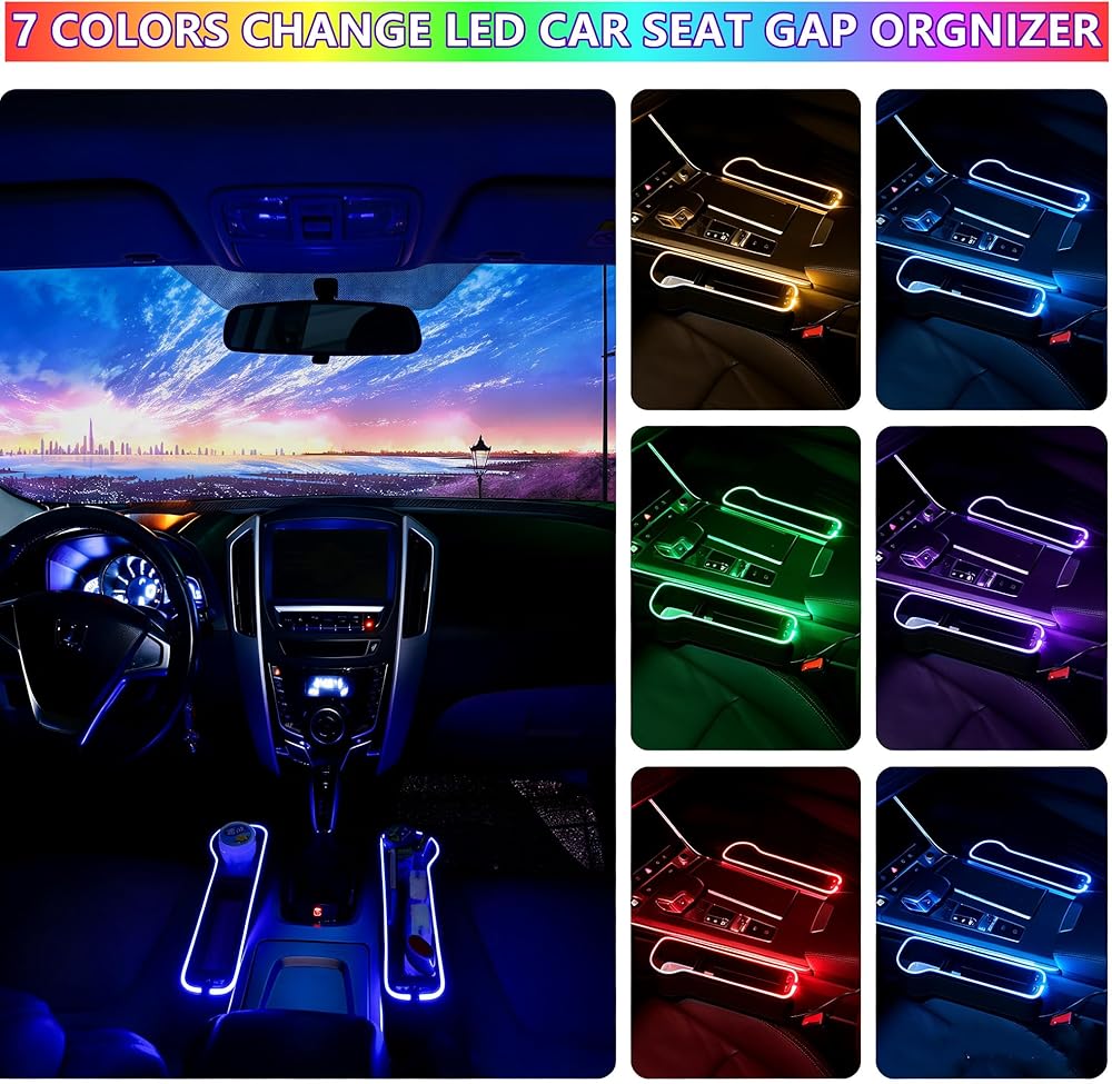 1:[7 Colors changing & 9 changing modes]The traditional gap filler for car seat with cup holder only has blue light,This newly car seat gap organizer with led lights comes with 7 colors changing and 9 changing modes,When the night comes,7-colors atmosphere lamp turns on and flashes repeatedly to lighting up the romantic atmosphere of the night,Following the rhythm of music makes people feel as exciting and fun as if they were in a bar.