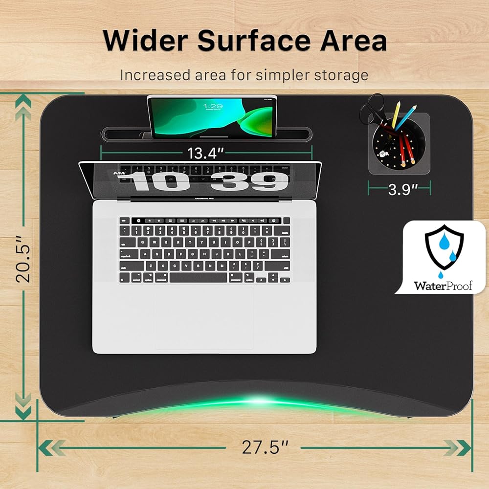 Strong and Durable: The rolling laptop desk is made of 100% cold-rolled steel, can withstand up to 17.6 pounds of weight. The desktop (27.5'L x 20.5'W) is spacious enough to accommodate computers, laptops, mice, cups and other items. And the table top is made of E0 grade ecological protection wood, which is resistant to dirt and not easy to scratch