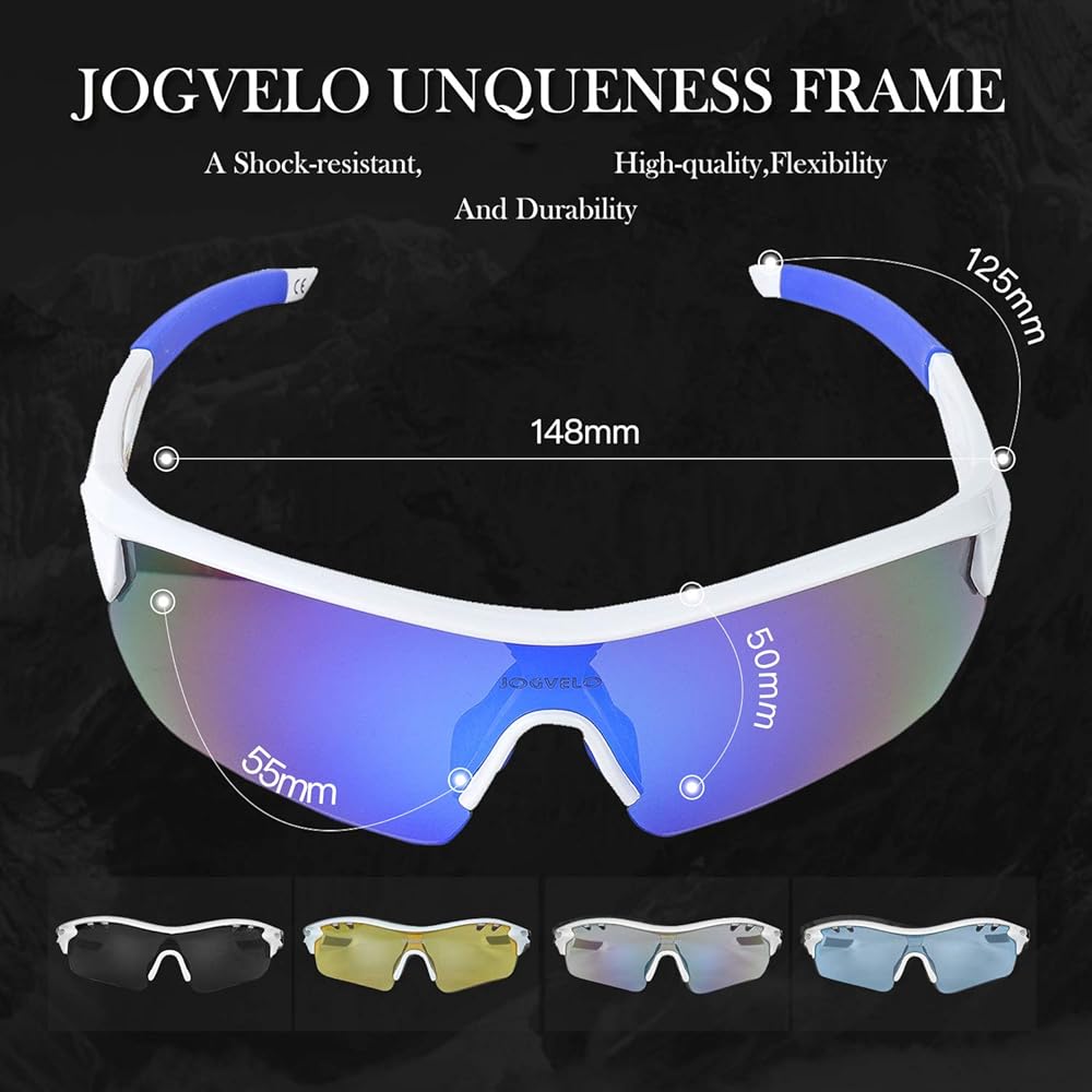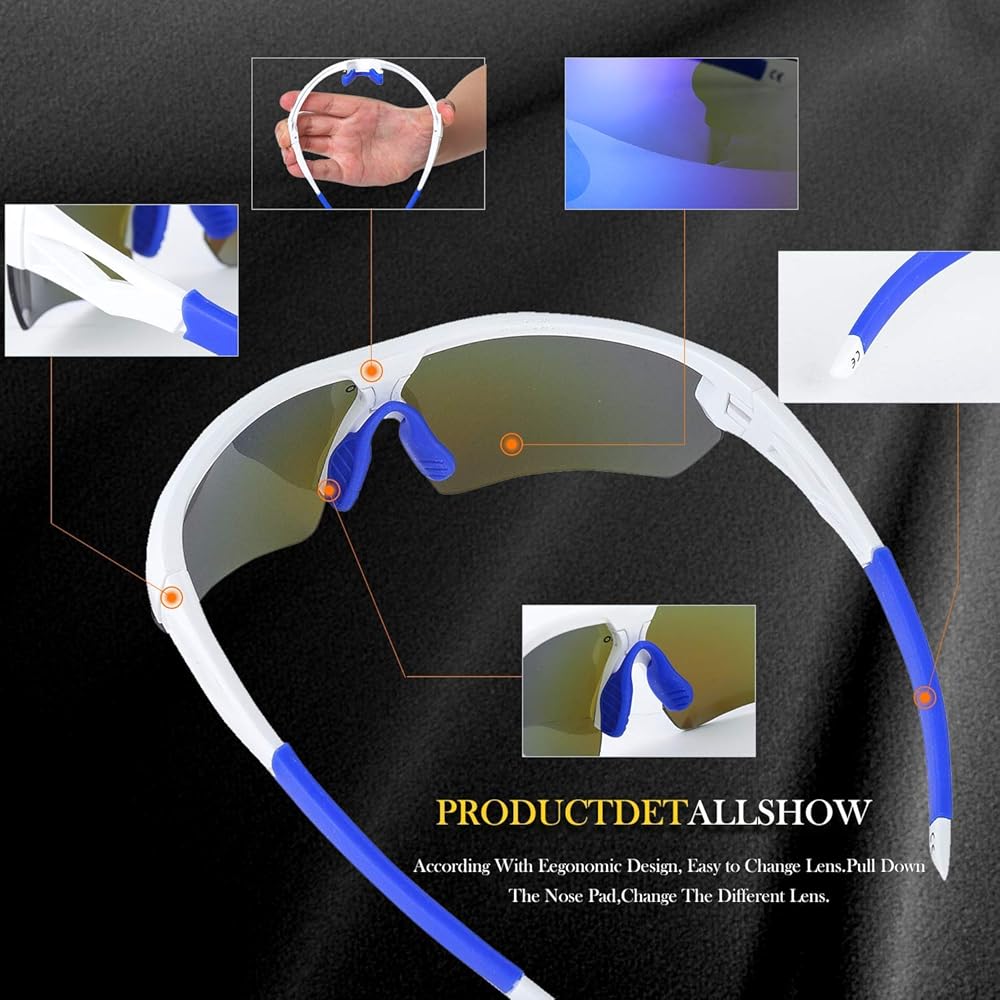 【5 interchangeable lens included】 The Main one is colorful lens ,the yellow one is for night activities, the blue one is for beach and travel, the transparent one is for cloudy and rainydays, the black one is polarized for driving and other activities.