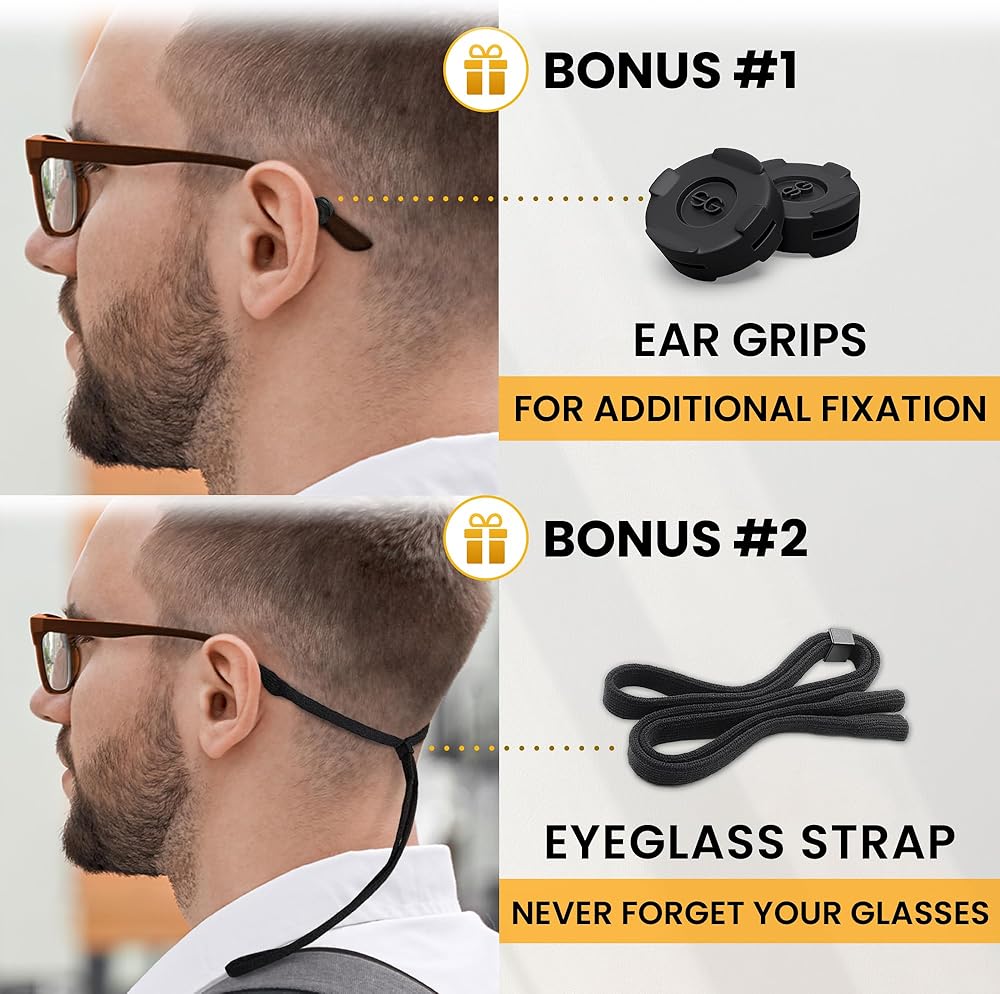Complete Bonus Package - enjoy a comprehensive package of sun glasses accessories, including 2 eyeglasses straps, a storage box, 6 pairs of sunglass eyeglass nose pad replacements, glasses ear grips for extra support and comfort, a cleaning cloth, and an instruction.