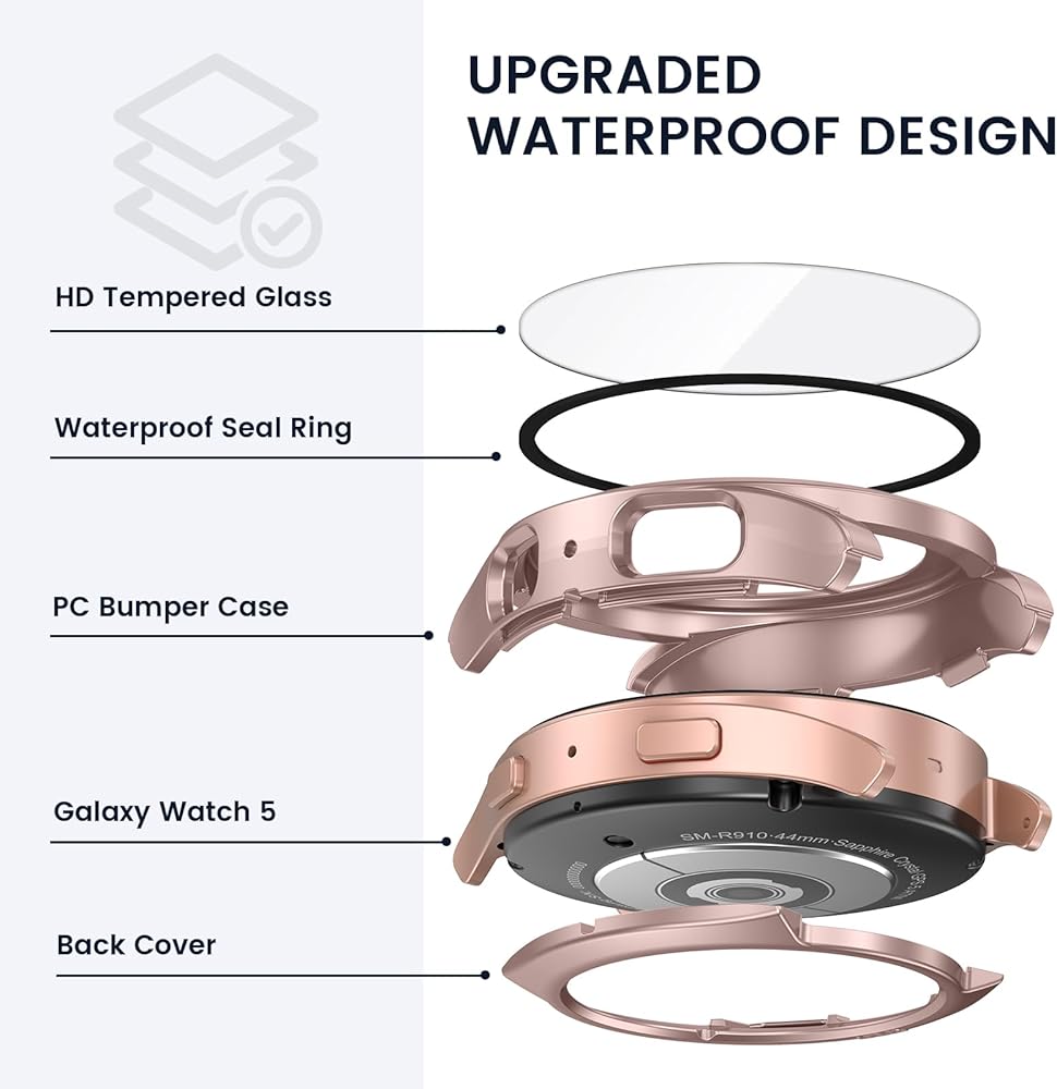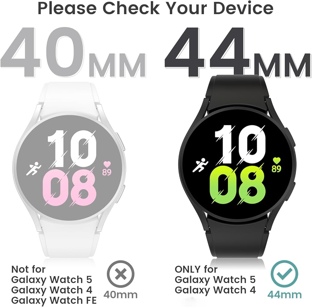 【Designed for Galaxy Watch 5 / Watch 4 44mm】ONLY FIT for your Samsung Galaxy Watch 5 44mm 2022 release & Galaxy 4 44 mm 2021 release Smartwatch! NOTE: Not compatible with Galaxy Watch 5 40mm 2022 & Galaxy Watch 4 40mm 2021 (Please choose the other size variation), NOT for Samsung Smart Galaxy Watch 5 Pro 45mm 2022, Galaxy Watch 6 44mm/40mm 2023, Galaxy Watch 6 Classic 43mm/47mm 2023 or other models.