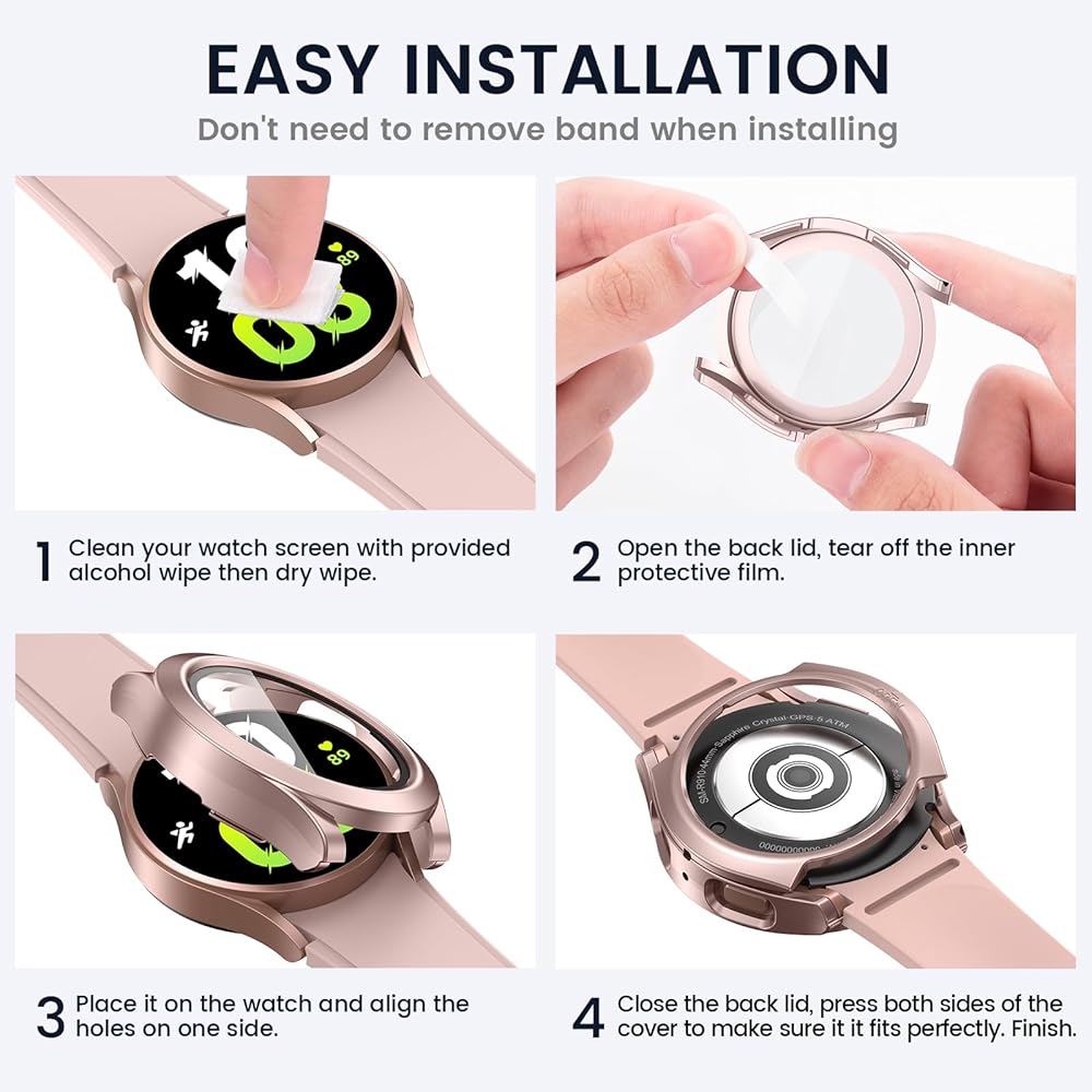 【Easy Installation】This Samsung watch 5/4 cases are easy to install without removing the band. 【Easy Removal】- A removal tool is included to remove the case without damaging the watch. 【What You Get】1 x 44mm Galaxy Watch front case, 1 x back cover, 1 x removal tool, 1 x cleaning tool. All our products have limited one-year after-sale service. So if there are any problems with it, please contact us without hesitation.