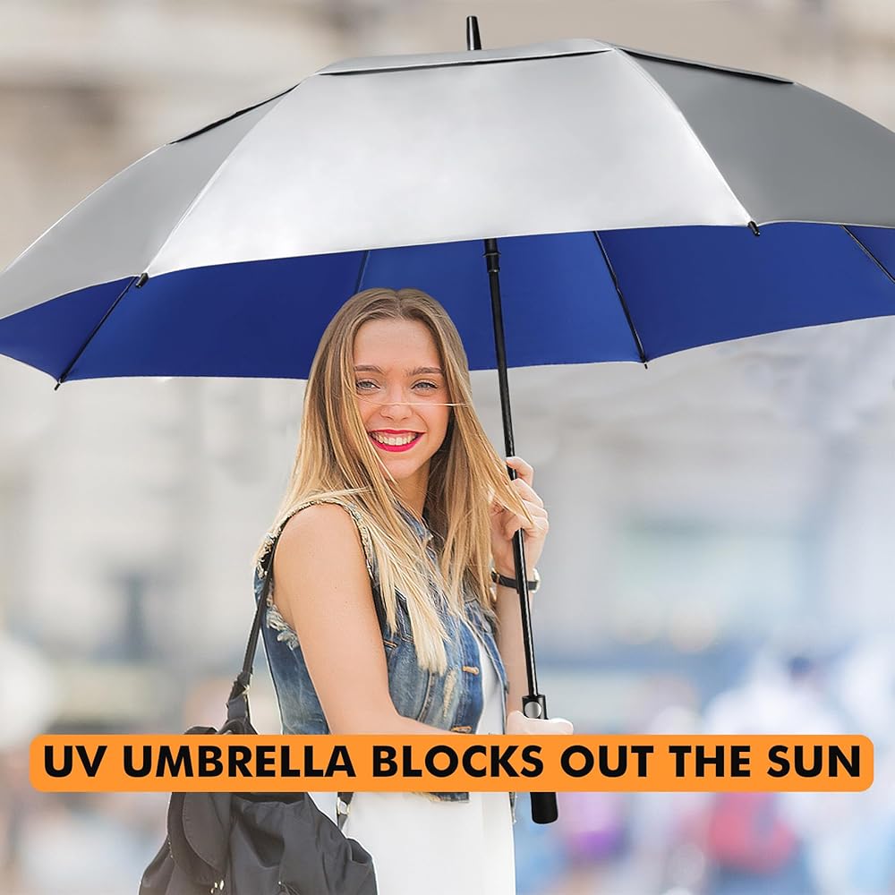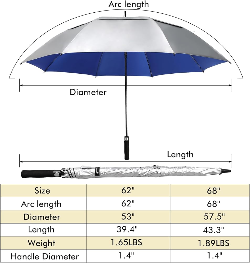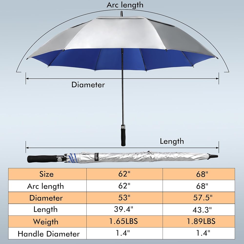 ☂️62 OR 68 INCHES EXTRA LARGE UMBRELLA PROVIDES MORE SHADE. The 62" golf umbrella is suitable to share for 2 adults or walk your dog. The 68" extra large umbrellas for sun would be a family size to keep 2 adults and 1 child against the sun. With this large golf umbrella, 2 people at least get covered, keep out of sunburn, protecting sensitive skin
