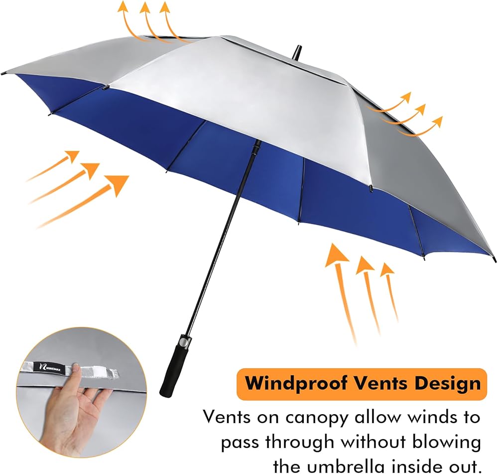 💨WINDPROOF GOLF UMBRELLA HAS VENTS ON CANOPY: 8 vents on canopy allow winds to pass through. This sun umbrella is designed and supposed to stand up wind speed over 26 mph. Great upgraded on wind resistance make sure the uv umbrella holds up on windy days. If you are sick of a fragile umbrella flipping out in any gust of winds, this golf umbrella windproof would not let you down