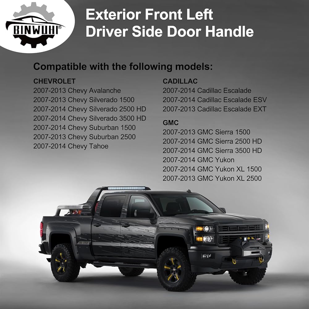 【COMPATIBILITY】This exterior door handle replacement for the rear left driver side door for 2007-2013 Chevy Silverado 1500 2500HD 3500HD | 2007-2013 Suburban 1500 2500 | 2007-2013 Tahoe Avalanche | 2007-2013 GMC Sierra 1500 2500HD 3500HD | 2007 2008 2009 2010 2011 2012 2013 Yukon, Yukon XL 1500 2500 | 2007-2013 Cadillac Escalade ESV EXT.