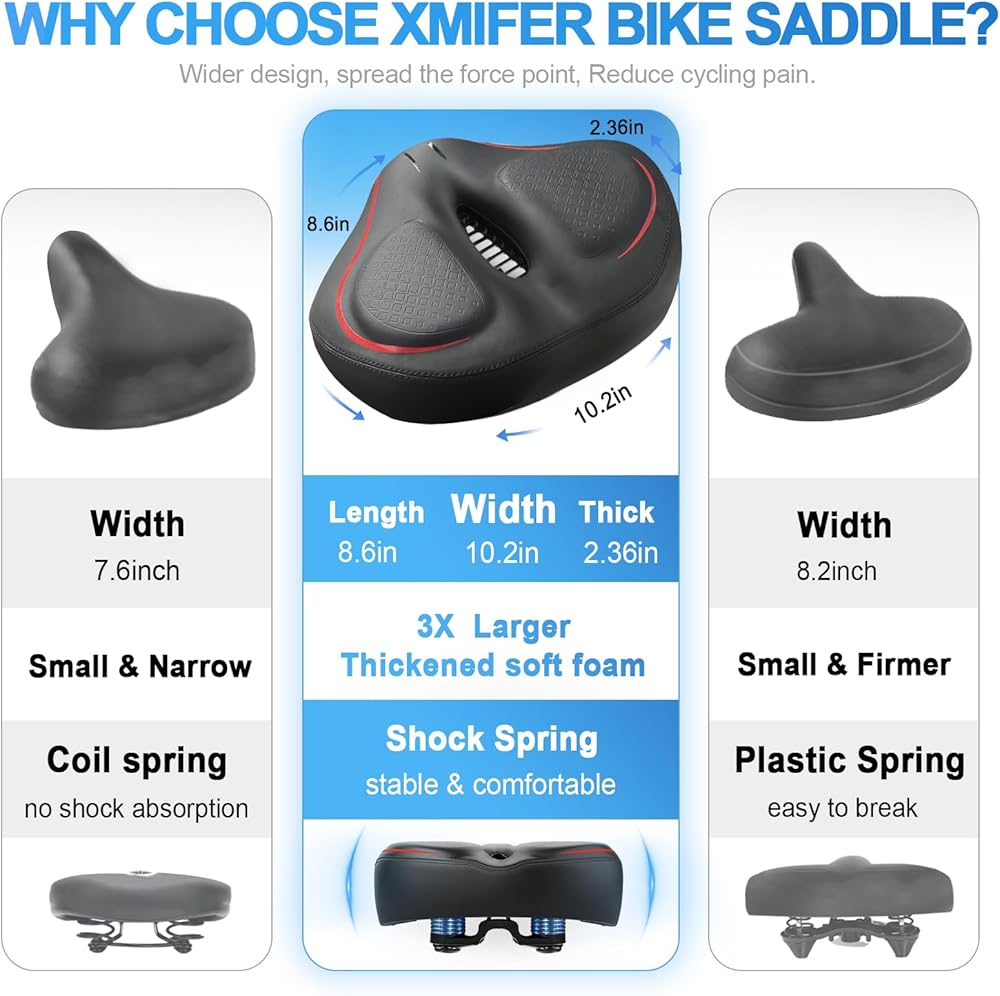 【Quality & Workmanship】 Xmifer focuses on the development and design of bike seat, tested by more than 50.000 cycling enthusiasts to refine the design and functions. Our wide bike seat is made of high density thickened foam and wear-resistant PU leather which is soft and waterproof.