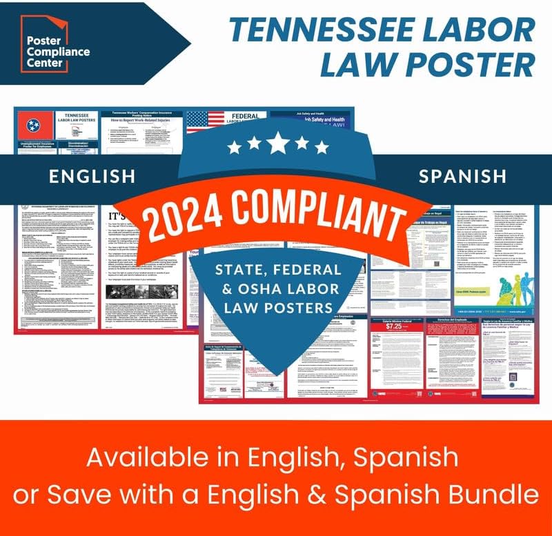 DUAL LANGUAGE AVAILABLE: All current mandatory Tennessee and Federal notices on an English poster, or Spanish poster, or a Bundle Package with both posters. It's important to ensure ALL your workers understand their labor law rights.