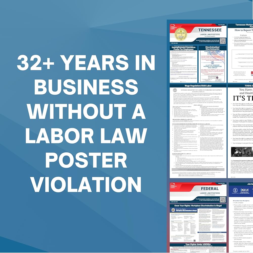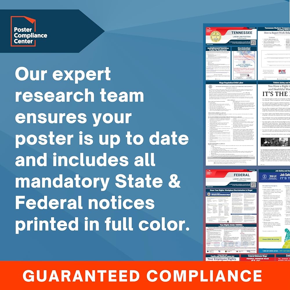 GUARANTEED COMPLIANCE & ACCURACY: Most up to date 2024 Tennessee State and Federal Labor Law Poster with all notices in one simplified design. Display notices such as minimum wage, OSHA, USERRA, Workers' Compensation, FMLA, Workplace Discrimination is Illegal, and more. Our compliance notices are regularly audited - in over 30 years of business, we have never incurred a labor law violation!