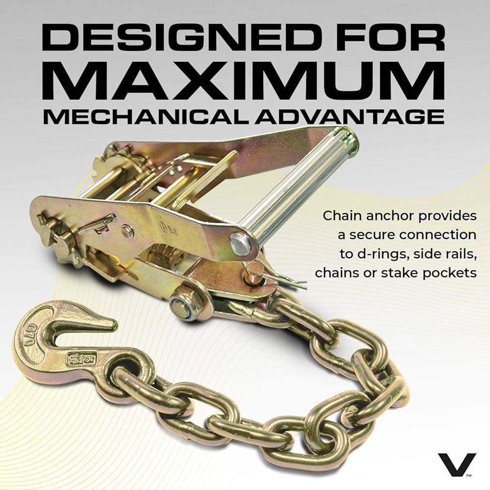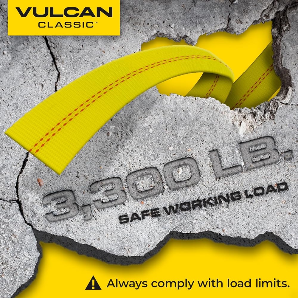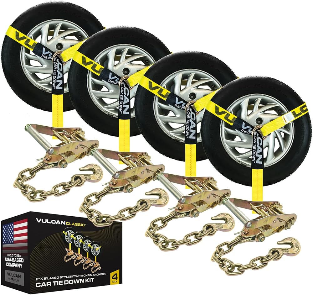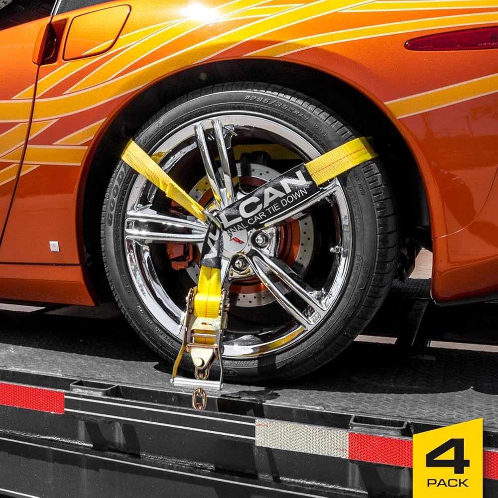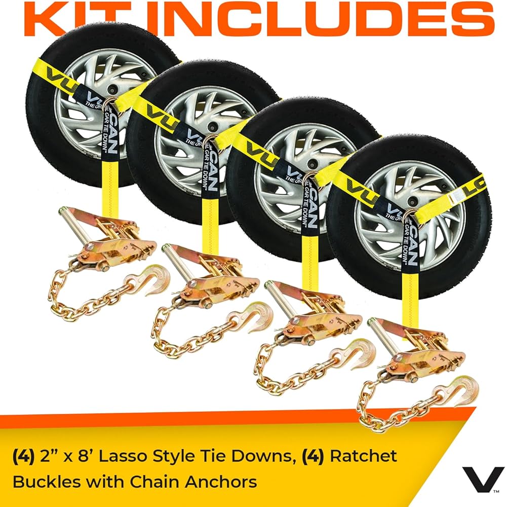 VULCAN Car Tie Down with Chain Anchors - Lasso Style - 2 Inch x 96 Inch - 4 Pack - Classic Yellow - 3,300 Pound Safe Working Load