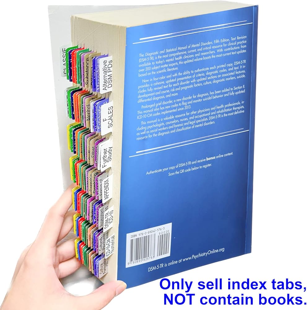 Every therapist needs a copy of the DSM in the latest version. Grad school makes this a requirement. It is very suitable for people studying in school, and is color-coded according for quick access. 96 Premium Laminated Waterproof PVC Peel-and-Stick Durable Tab. Tabs are color coded for quick access: children's diagnoses are yellow, substance related diagnoses are orange, moods are blue... Package Contents: 96 Large Index tabs for DSM-5-TR or DSM-5 edition , Which contains 12 Blank customize tabs. Solid color background unisex Save your time cost: Has more diagnostic names than on the market. The tabs make finding the various diagnoses in the DSM easier to locate at a moment's notice. And most of the diagnosis names have no abbreviated words, using them will make you more clear at a glance. 12 Blank customize tabs. 1 Tab positioning guide.(Can be used as bookmark) Double-Sided Big Print Easy to Read - Vibrant Colors help you read the DSM better.