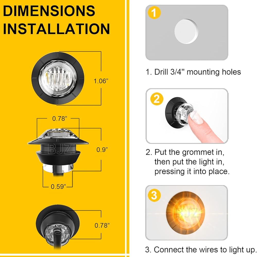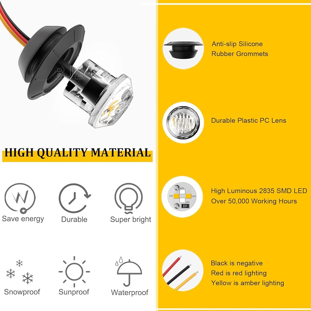 ✔🚘【𝘼𝙢𝙗𝙚𝙧 𝙩𝙤 𝙂𝙧𝙚𝙚𝙣 𝘿𝙪𝙖𝙡 𝘾𝙤𝙡𝙤𝙧 𝘼𝙪𝙩𝙤𝙢𝙤𝙩𝙞𝙫𝙚 𝙈𝙖𝙧𝙠𝙚𝙧 𝙇𝙞𝙜𝙝𝙩𝙨】Each 3/4 inch LED trailer light has 4 built-in SMD LEDs(2𝘼𝙢𝙗𝙚𝙧&2𝙂𝙧𝙚𝙚𝙣) that steadily alternate amber and green with high brightness light output to meet driving needs. IP68 waterproof, 12V DC voltage, 0.02A-0.04A current, 0.5Watts power, 60LM lumen; Wire Gauge: 22AWG.
