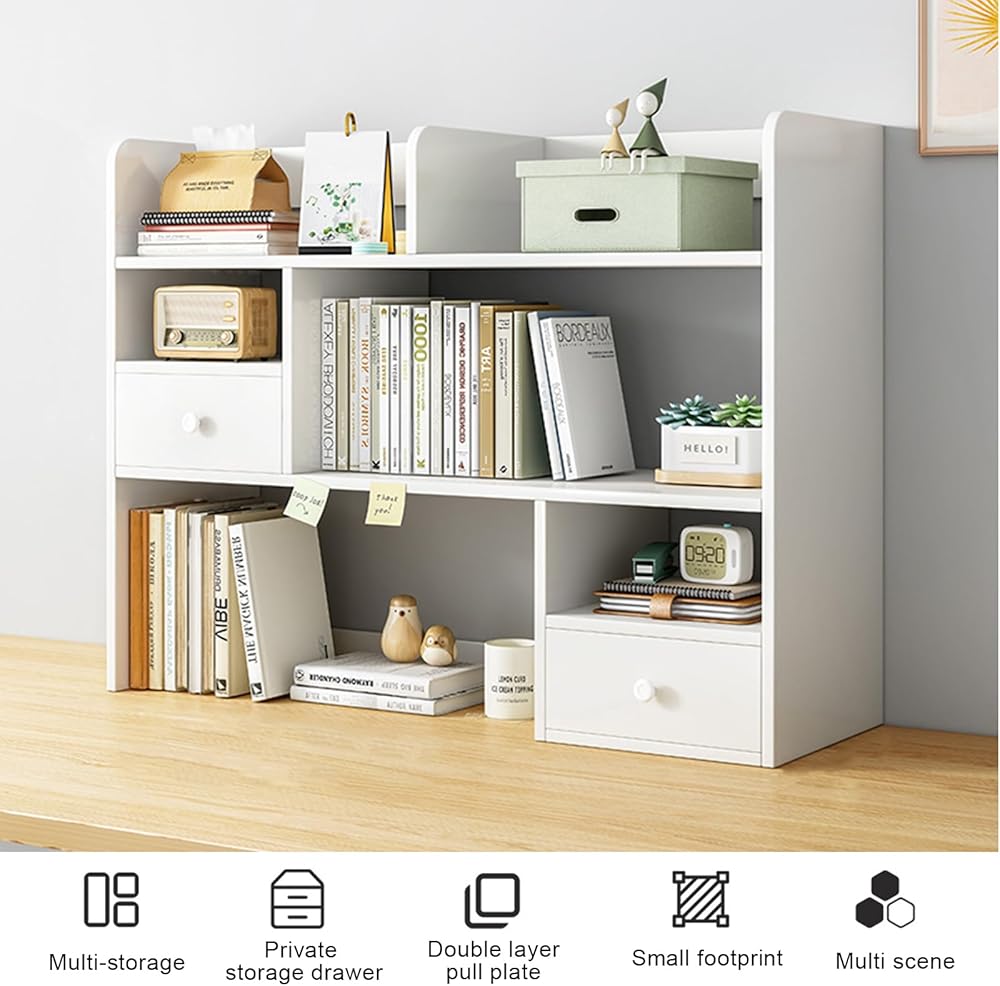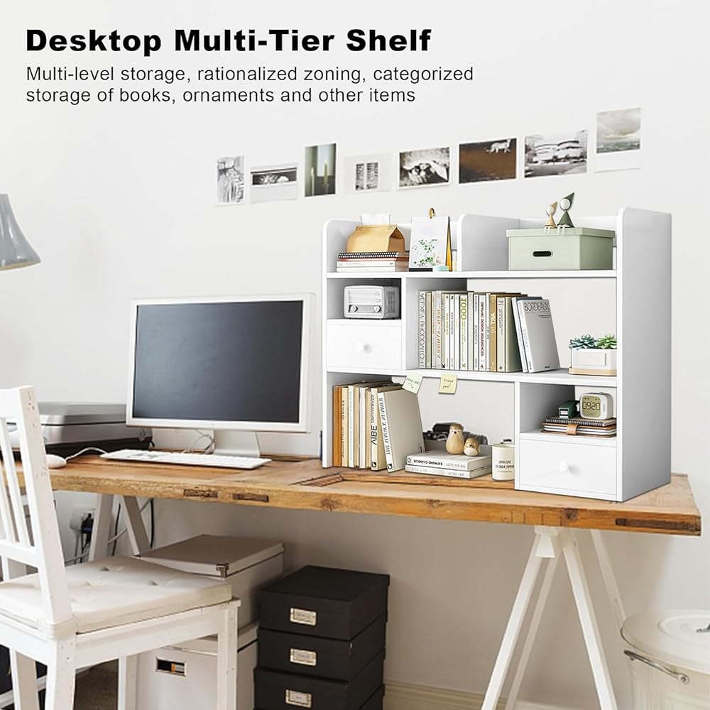 3-Tier Wood Desktop Bookshelf, Multipurpose Bookshelf Storage Organizer with 2 Drawers, Countertop Storage Hutch with 9 Shelves,Multipurpose Wood Desktop Hutch Storage Organizer for Dorm Office Home