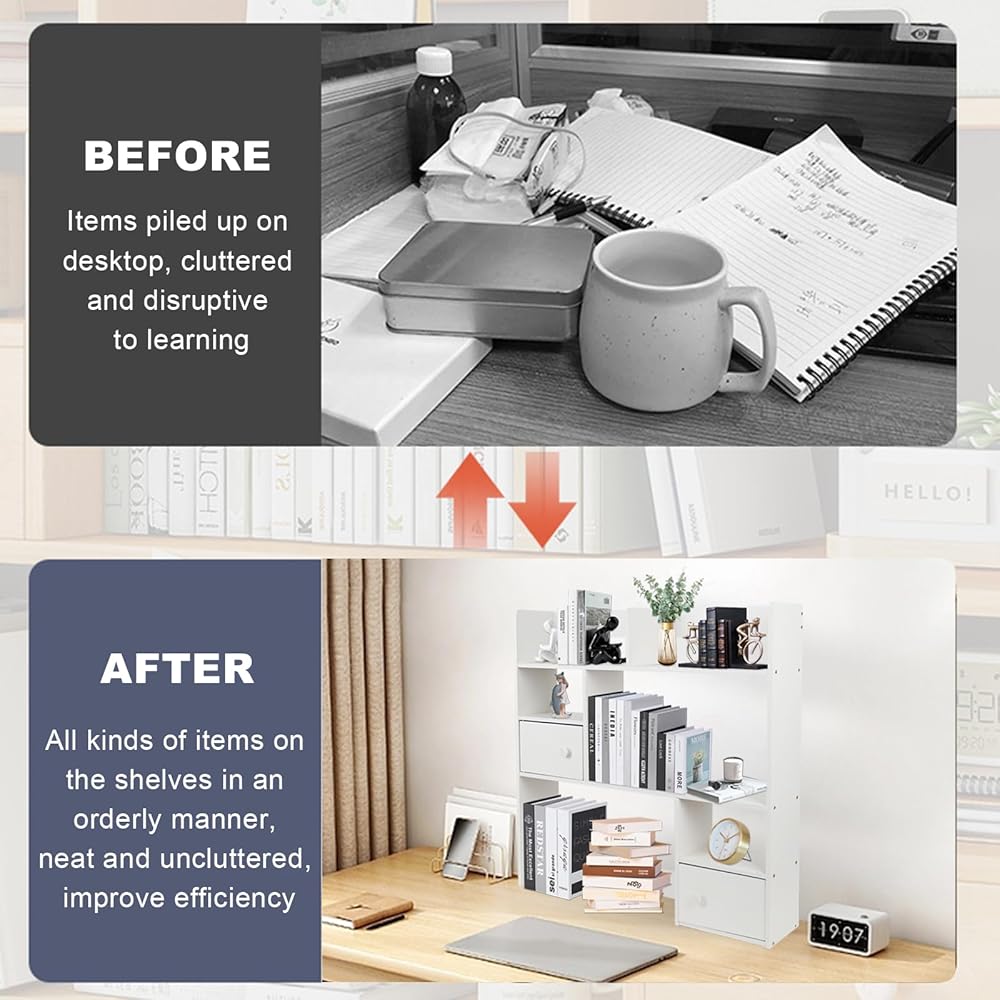【Space-saving Design】With its compact size and vertical design, this wood desktop bookshelf is perfect for small spaces. It can be placed on your computer desk, countertop, or any other flat surface. The 3-tier design maximizes vertical space utilization without taking up too much space on your desk.