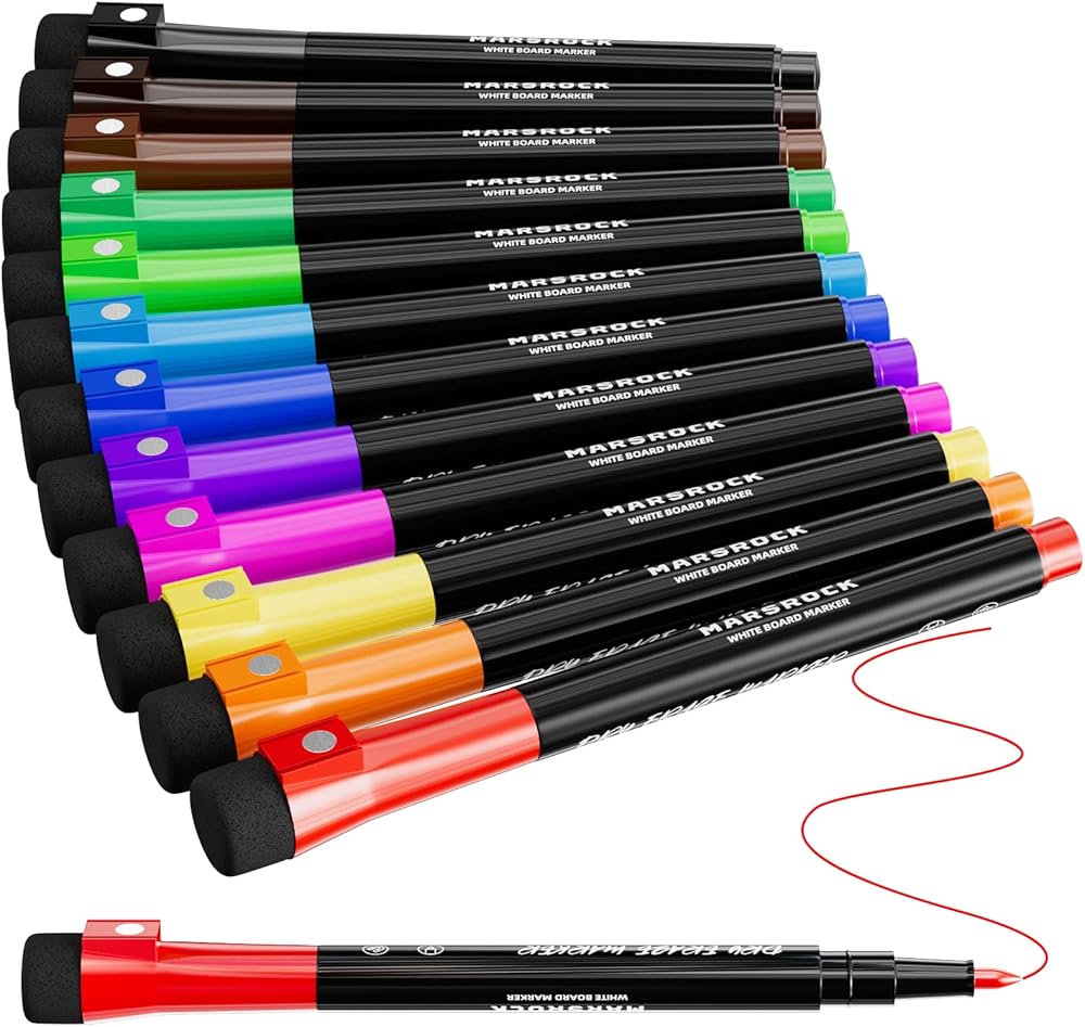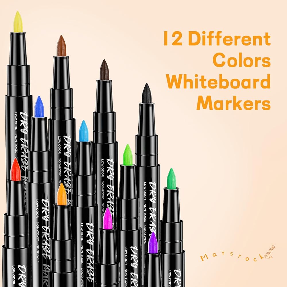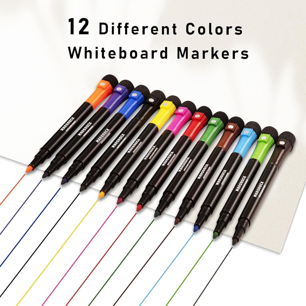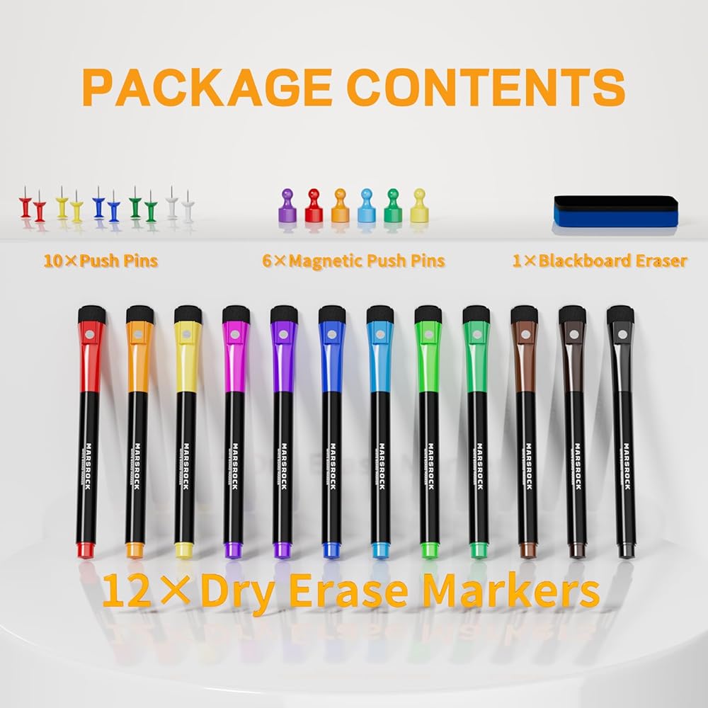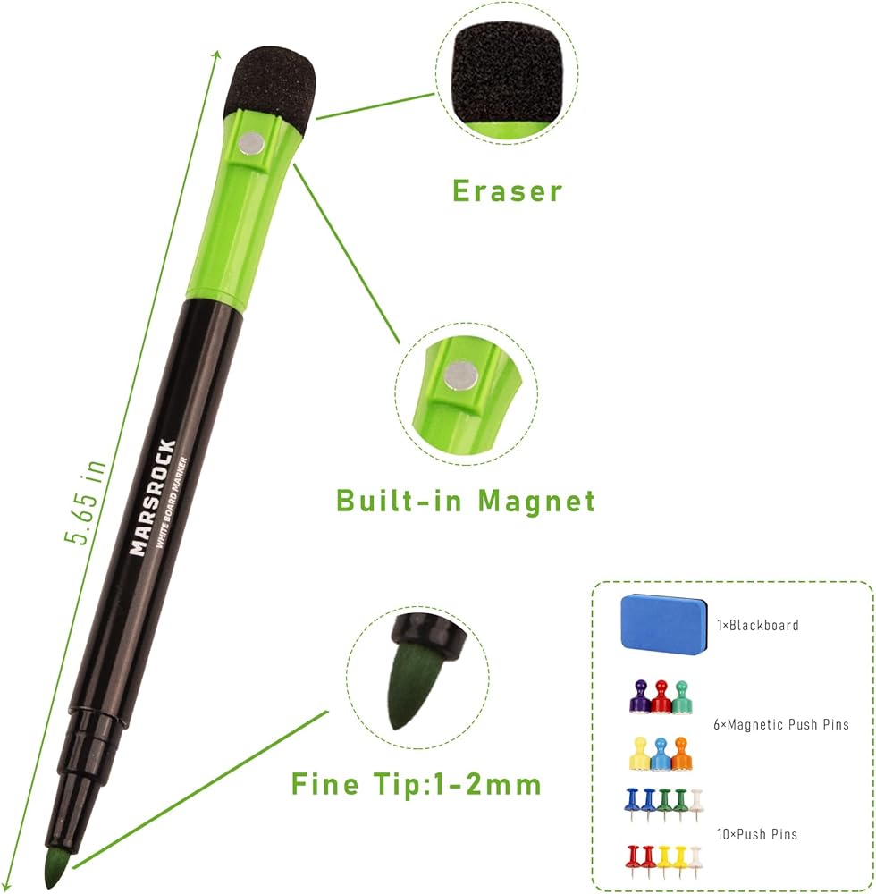 Dry Erase Markers Fine Tip - 12 Count Colorful Low Odor Magnetic Whiteboard Markers with Eraser, 6 Magnets, 10 Push Pins & a Blackboard Eraser for Kids School Supplies Calendar Boards Office