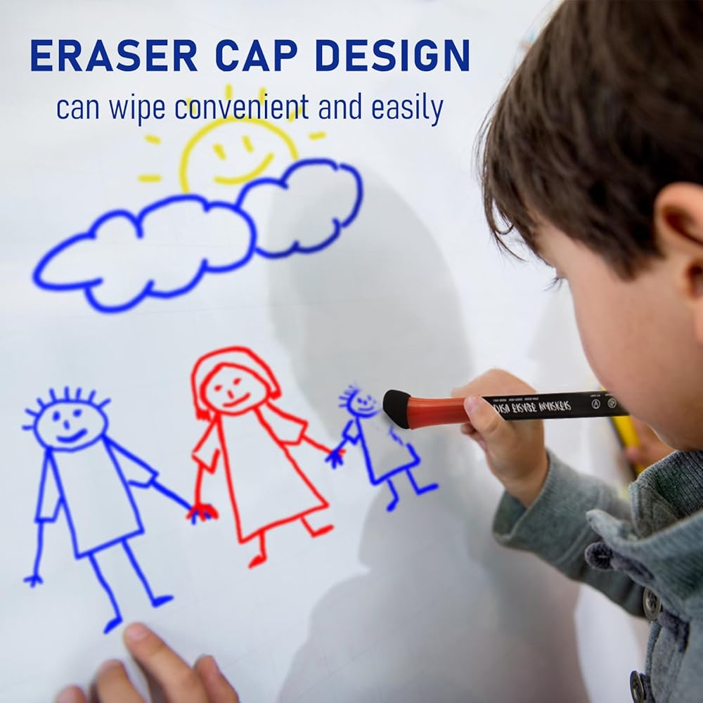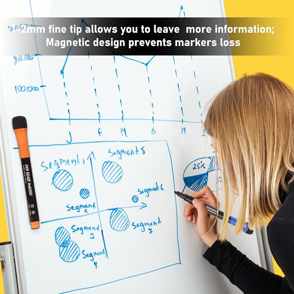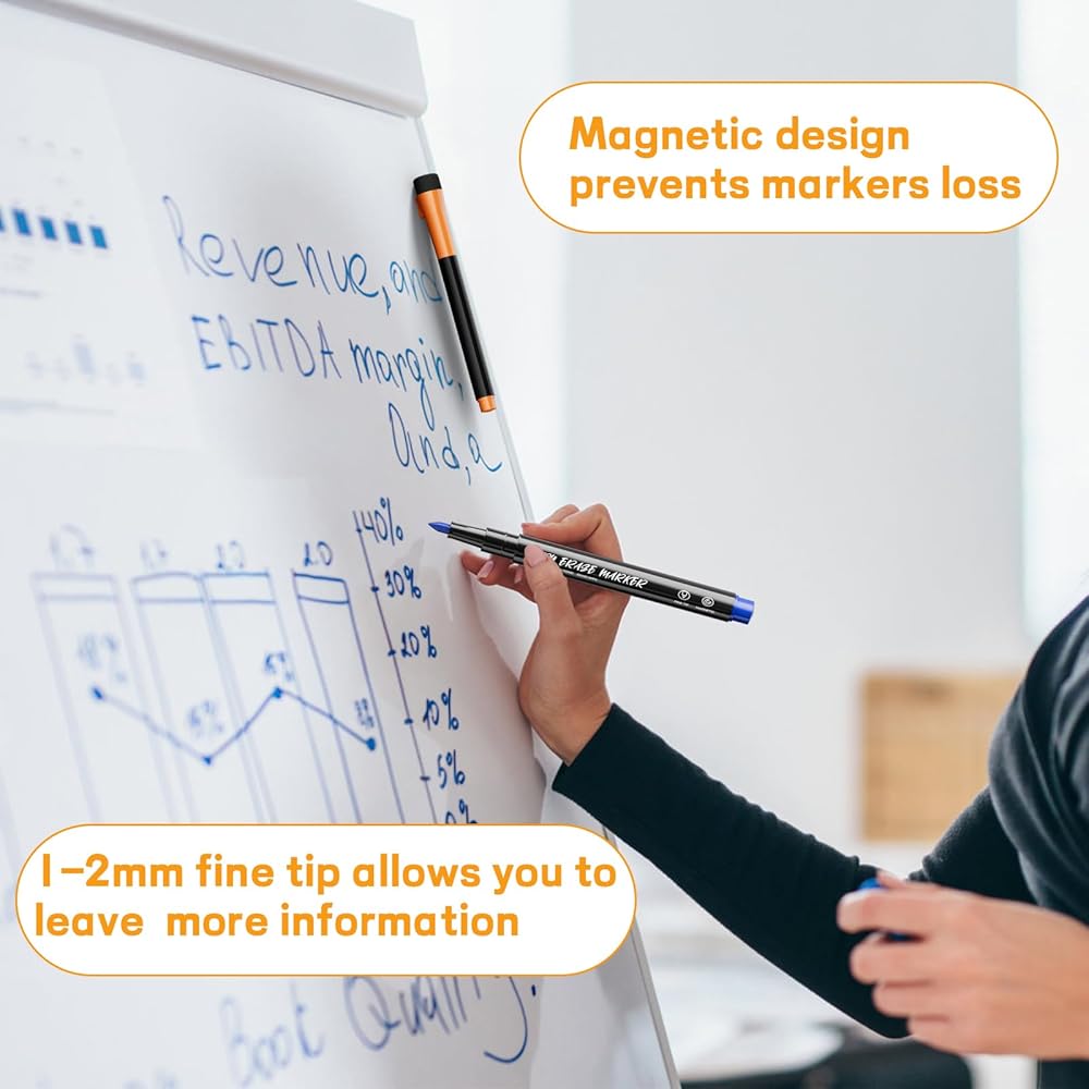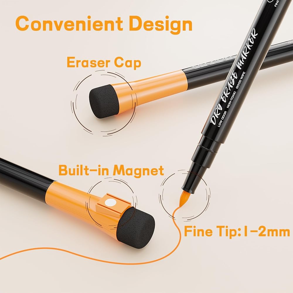 【Convenient Design】Our 1-2mm fine point dry erase markers designed with a strong magnet and eraser cap offers you a smooth writing experience. The magnet allows the marker to be placed directly on the refrigerator to avoid loss. The built-in eraser can wipe small mistakes easily and quickly.