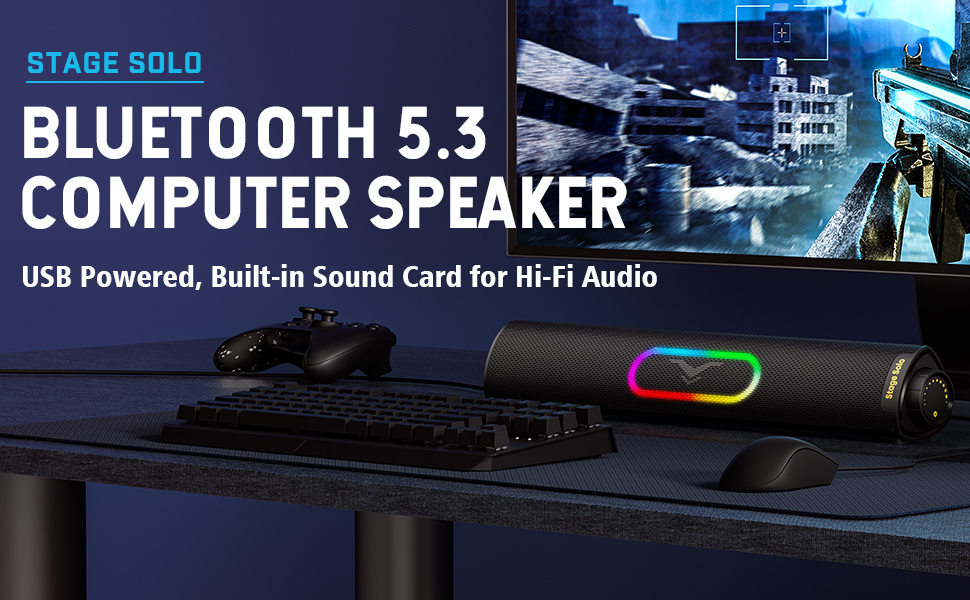 Solo Computer Speakers for Desktop PC, HiFi Stereo Soundbar with 4 RGB Modes, Bluetooth 5.3 & USB Plug-N-Play & 3.5mm Wired Connection, USB Powered Speakers for PC/Laptop/Desktop/Projector/Gaming