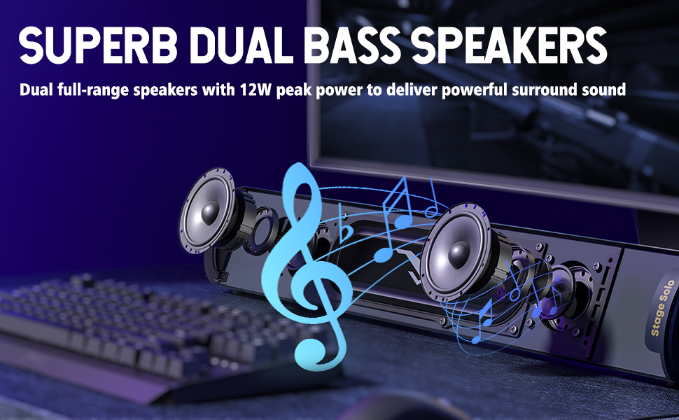 [Full Dynamic Range Audio]: Stage Solo computer speaker is equipped with 2 full-range drivers and bass up radiator, boasting a wide soundstage and immersive audio performance of treble and deep bass. The 4-core USB cable is built in DAC chip to decode high-res audio, this USB computer speaker generates richer, clearer and crispier cinematic sound.