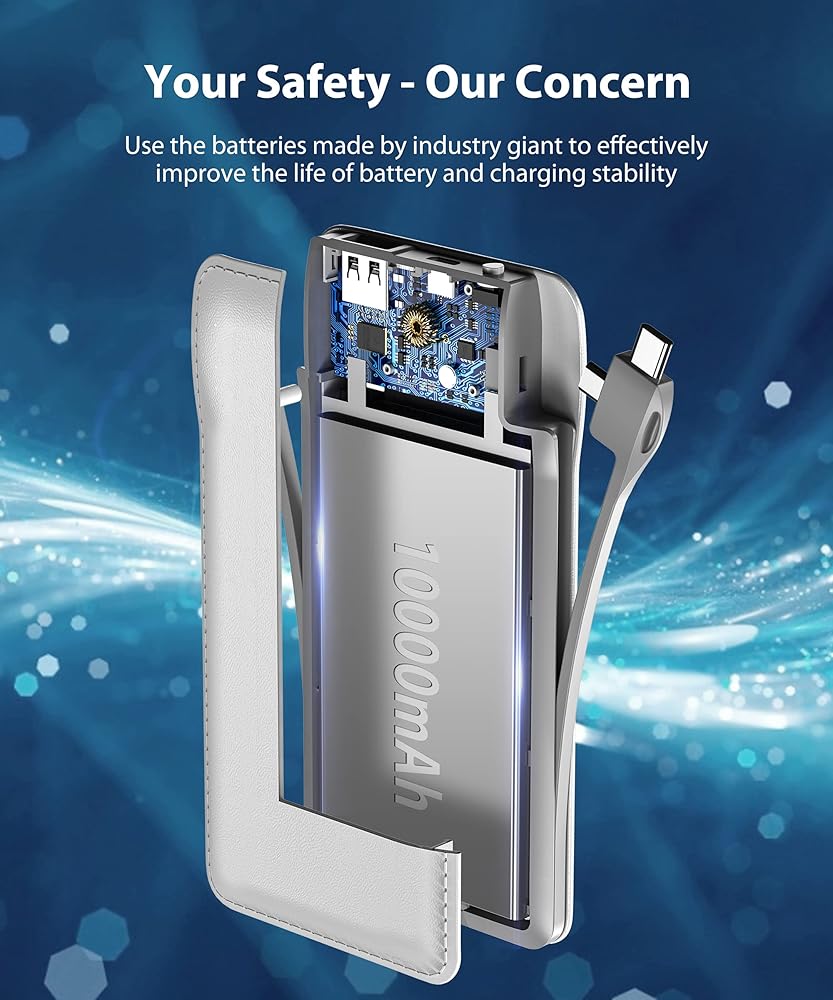 ★【What's You Get 】1* Power Bank 10000mah, 1* Type C Charging Cable for charging powerbank itself (charging adapter not included), 1*User Guide, 12-month warranty and friendly & outstanding customer service. Any question with the portable charger, please email us, and we will reply within 24 hours. Portable charger power bank, power bank with built in cables, external phone battery charger, usb c portable charger, phone battery charger portable, mobile charger.