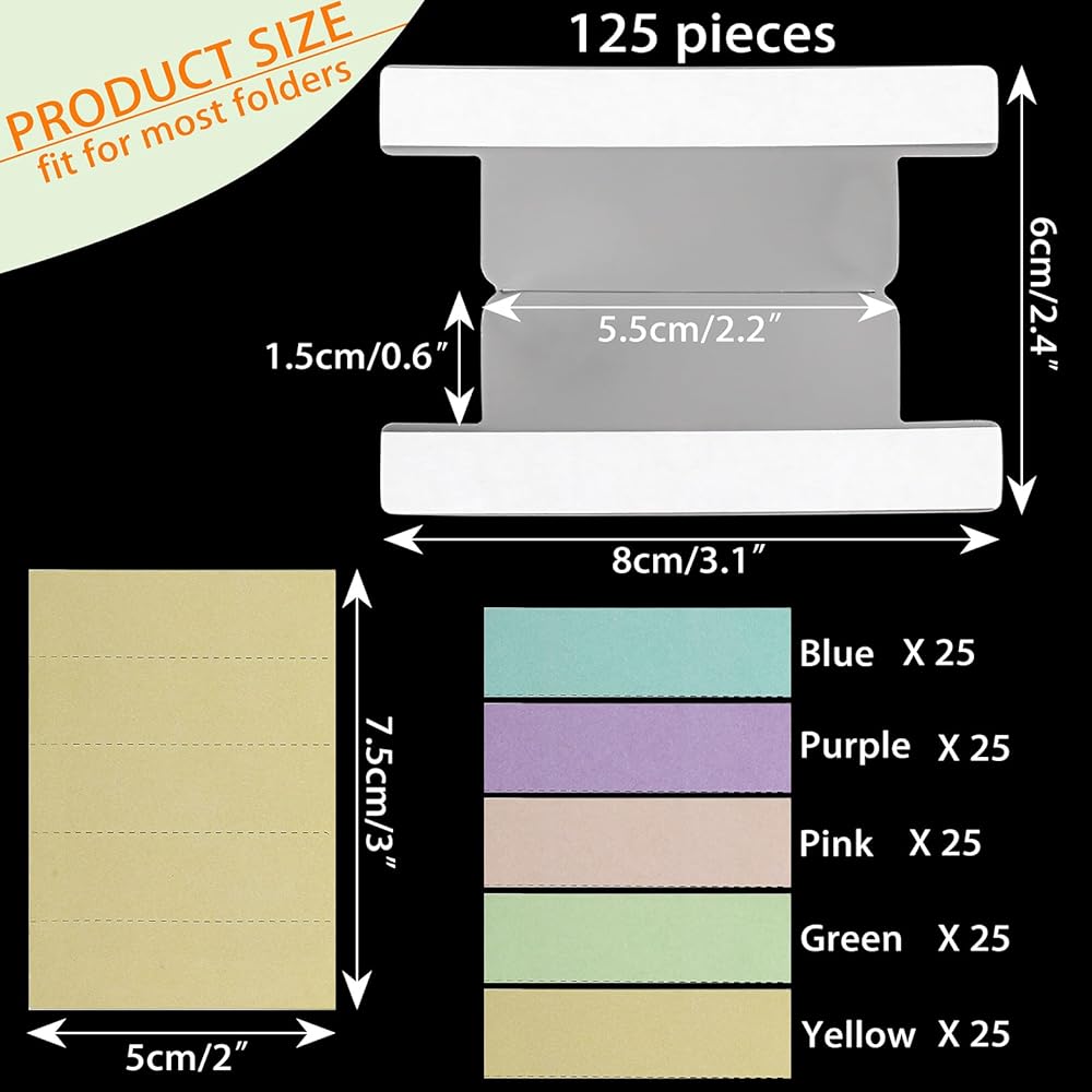 Enough Index Tabs - You will get 75 pieces 2.2 inch adhesive file folder tabs and 75 blank colored file folder paper inserts in 5 colors, including green, yellow, blue, pink and purple, 15 of each color with size of 2 x 0.6 inches/ 5 x 1.5 cm, providing a plentiful supply to meet your various needs.