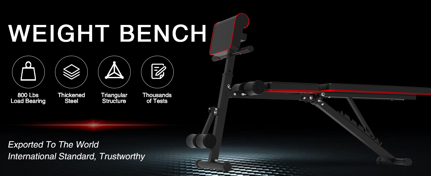 【Foldable Structure】This adjustable weight bench with leg extension measures 52.2 x20 x36 inch and weighs about 22.05 pounds; maximum load capacity is 800 pounds.It is safe, stable and easy to fold. You don't need to loosen many screws. Just pull out three pins and put down the pad to complete the folding, you can place it in your home next to the wall, under the bed, under the cabinets, etc., with a very small footprint, and no need to worry about this thing at all!