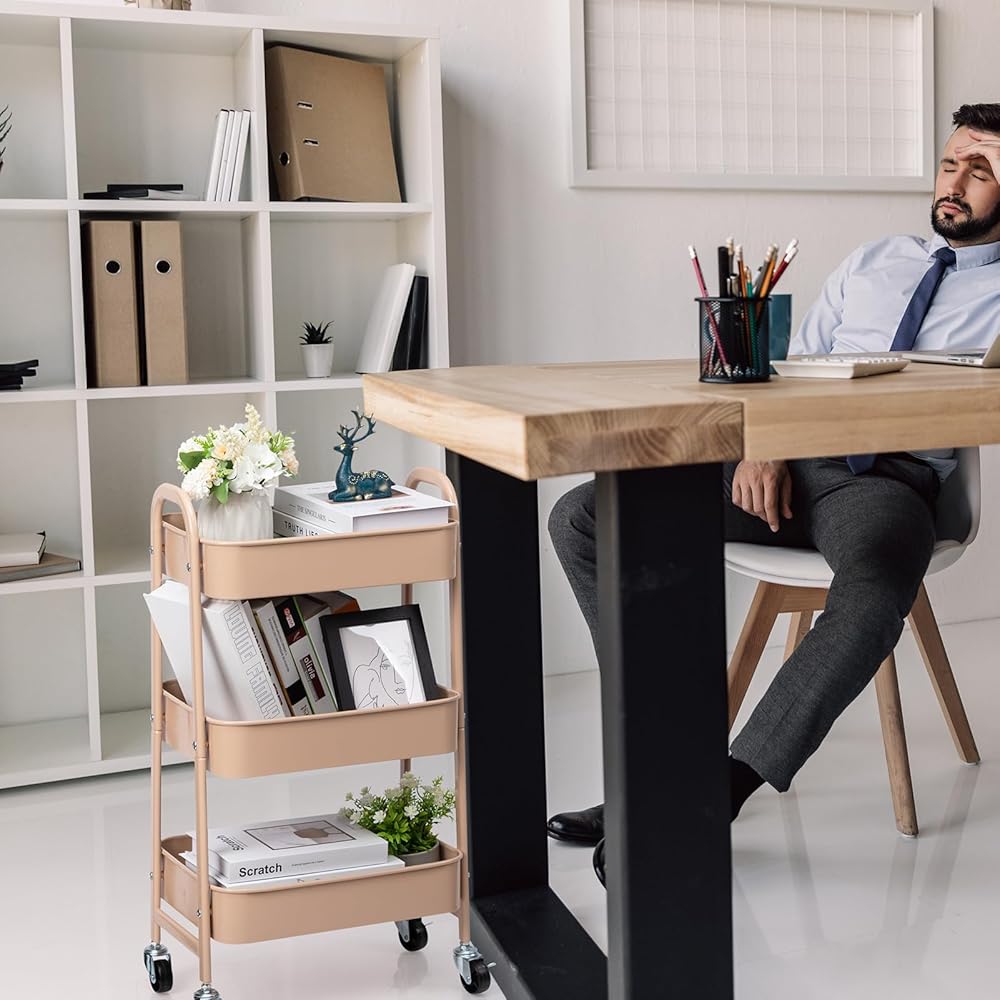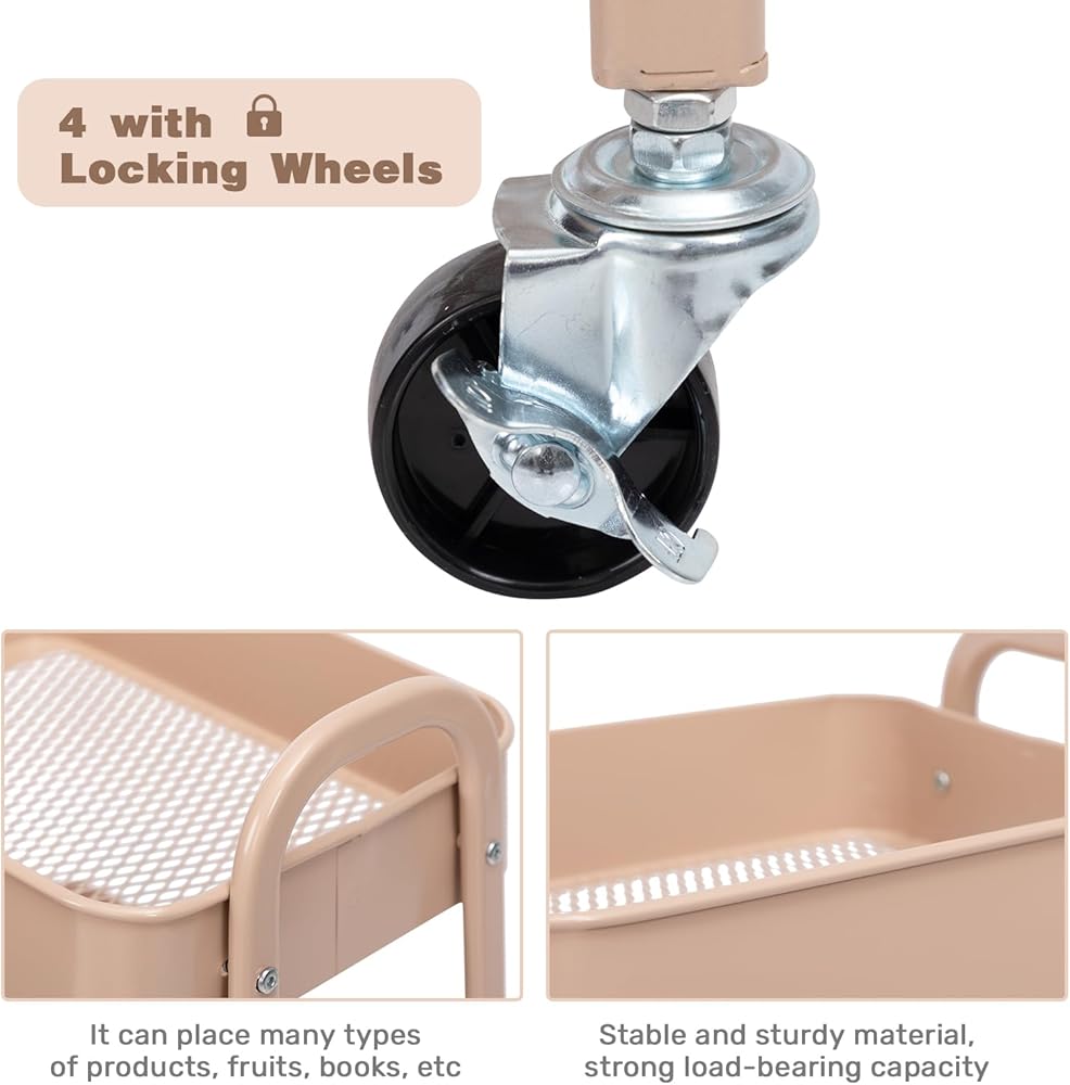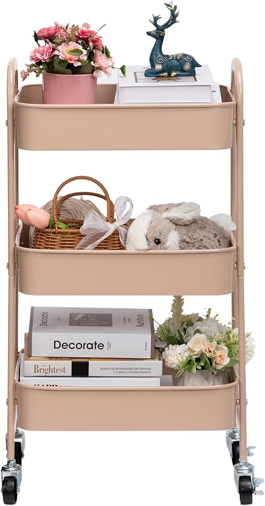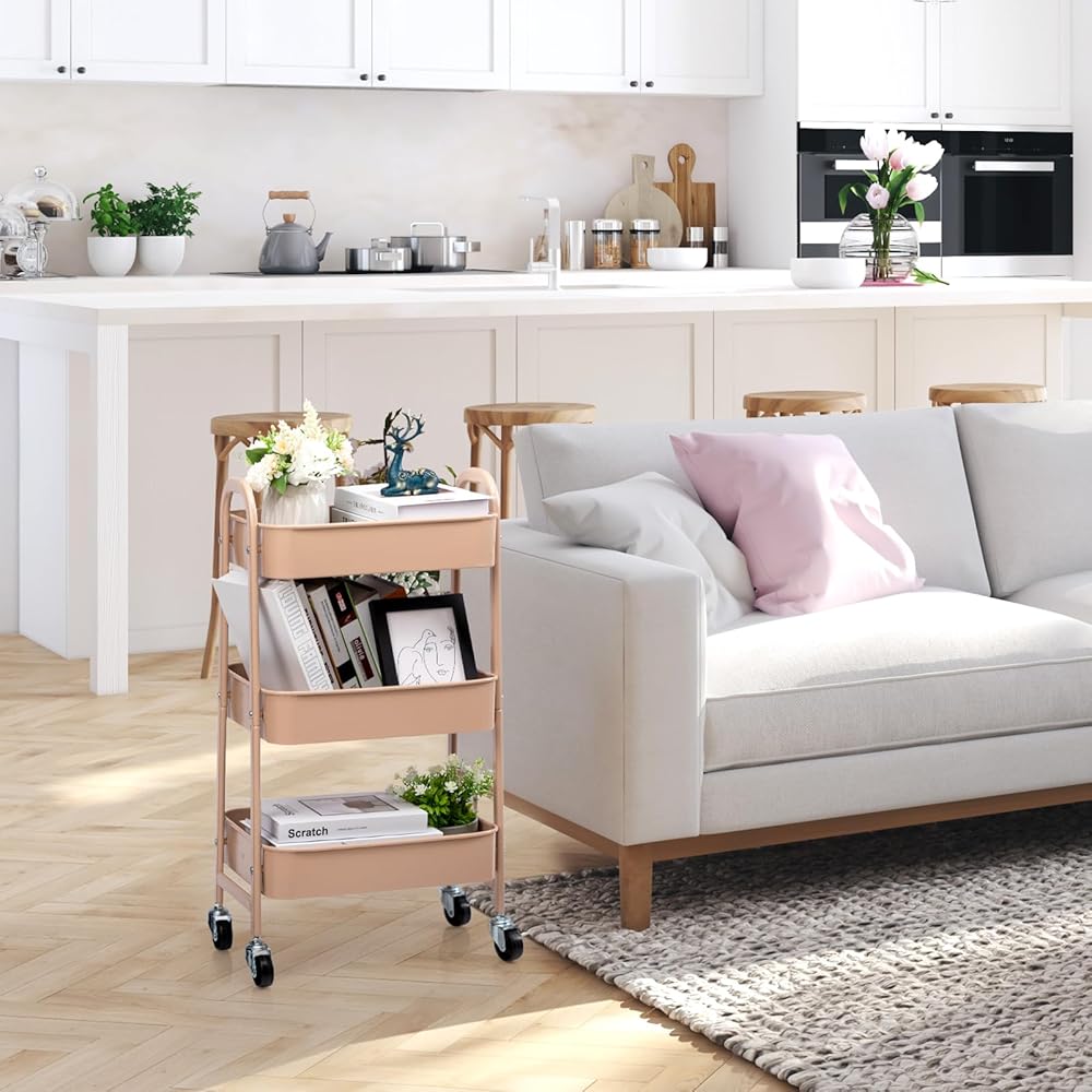 AGTEK 3 Tier Utility Rolling Cart with Lockable Wheels, Metal Multifunctional Storage, Organizer Cart for Kitchen, Office, Living Room, Makeup, Craft, Art Studio, Blush