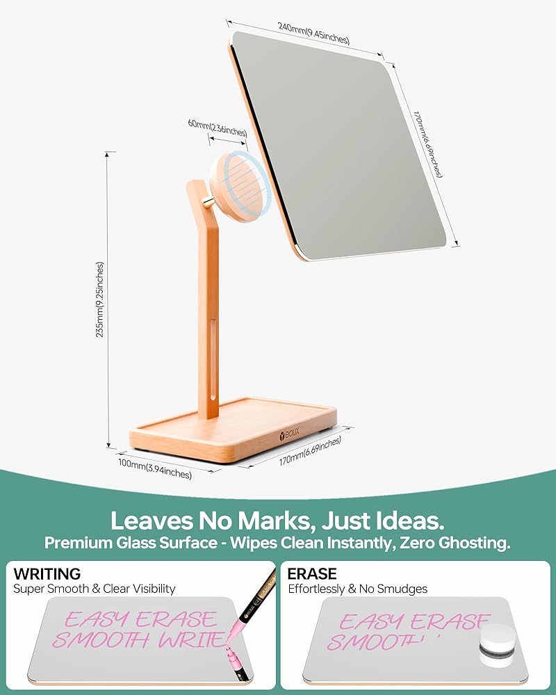 SMART & COMPACT DESIGN | Our Desk Dry Erase Board with Compact & Portable Size For Easy Carrying and Help Conserve Usable Desktop Space, the Reversible Solid Hardwood Stand Allows the Glass Dry Erase Board Lay Down for Comfortable Writing or Stand Up on Desk for Easy Viewing.