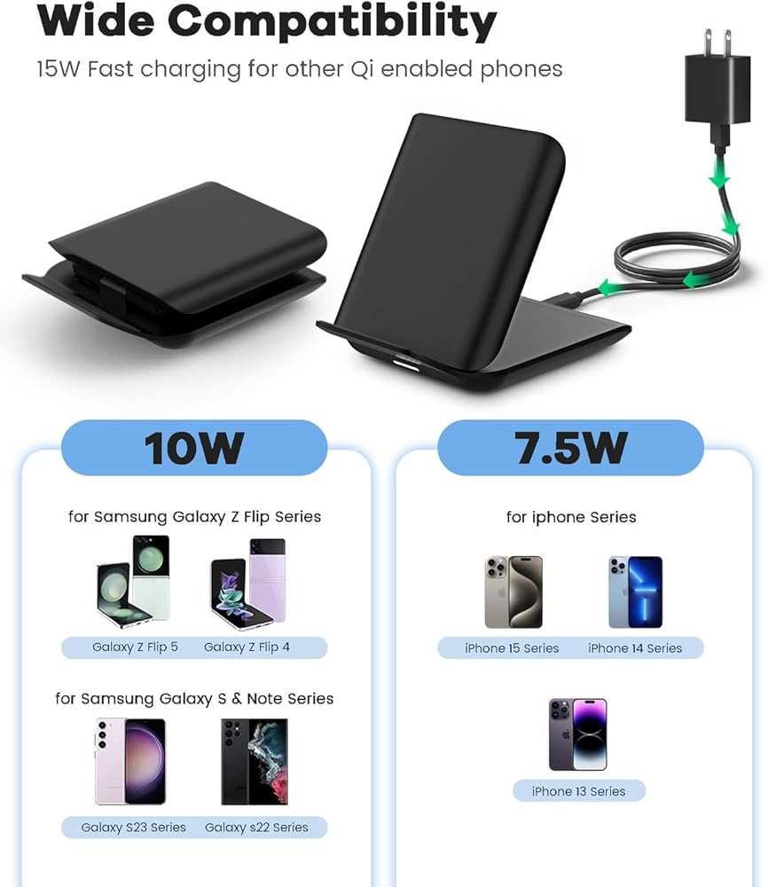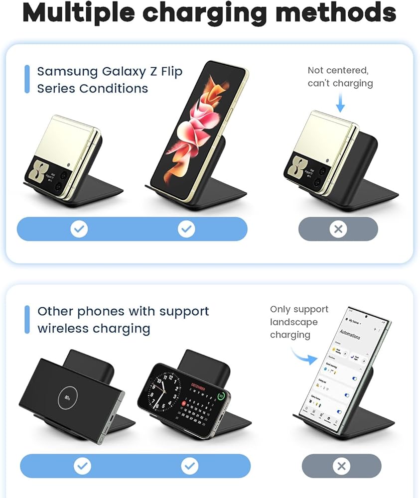 【2-in-1 Wireless Charger】This z flip wireless charger is foldable, small, and doesn't take up much space, and is designed for the Galaxy Z Flip and Razr+ series of phones! Also compatible with iPhone 15/14/13/12/11 series and Galaxy S24/S23/S22/S21, Note20/10 series! The watch charging area is compatible with Galaxy Watch 6 Classic/6/5 Pro/5/4 Classic/4/3/Active 2/Active (Tips: Not compatible with Apple Watch and Galaxy Watch 1/Gear S2/Gear S3/ Gear Sport)