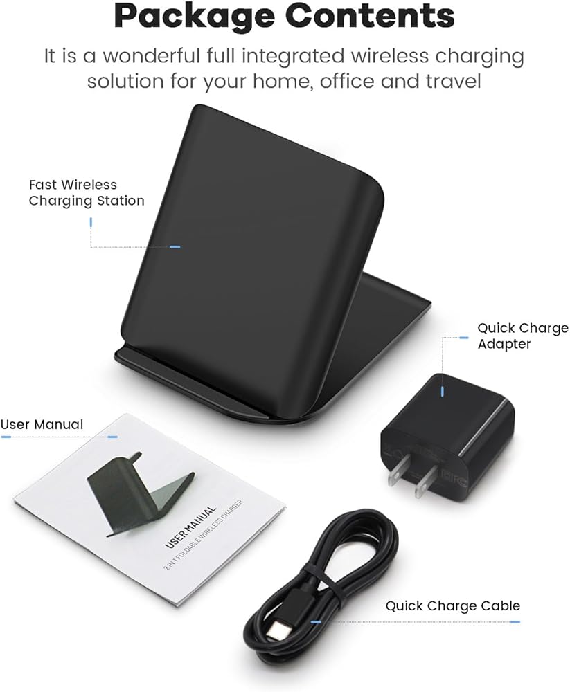 【What's in The Box】Package includes: 1 x 2-in-1 wireless charger, 1 x PD charging adapter, 1 x USB Type-C charging cable, and 1 x user manual.