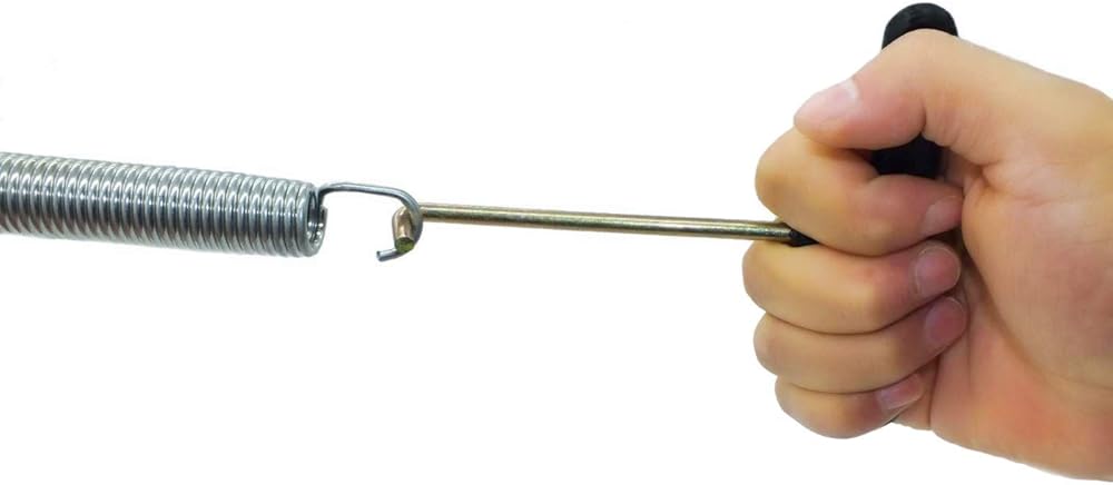 This trampoline spring pull tool has a plastic handle with a finger groove for comfort and support
