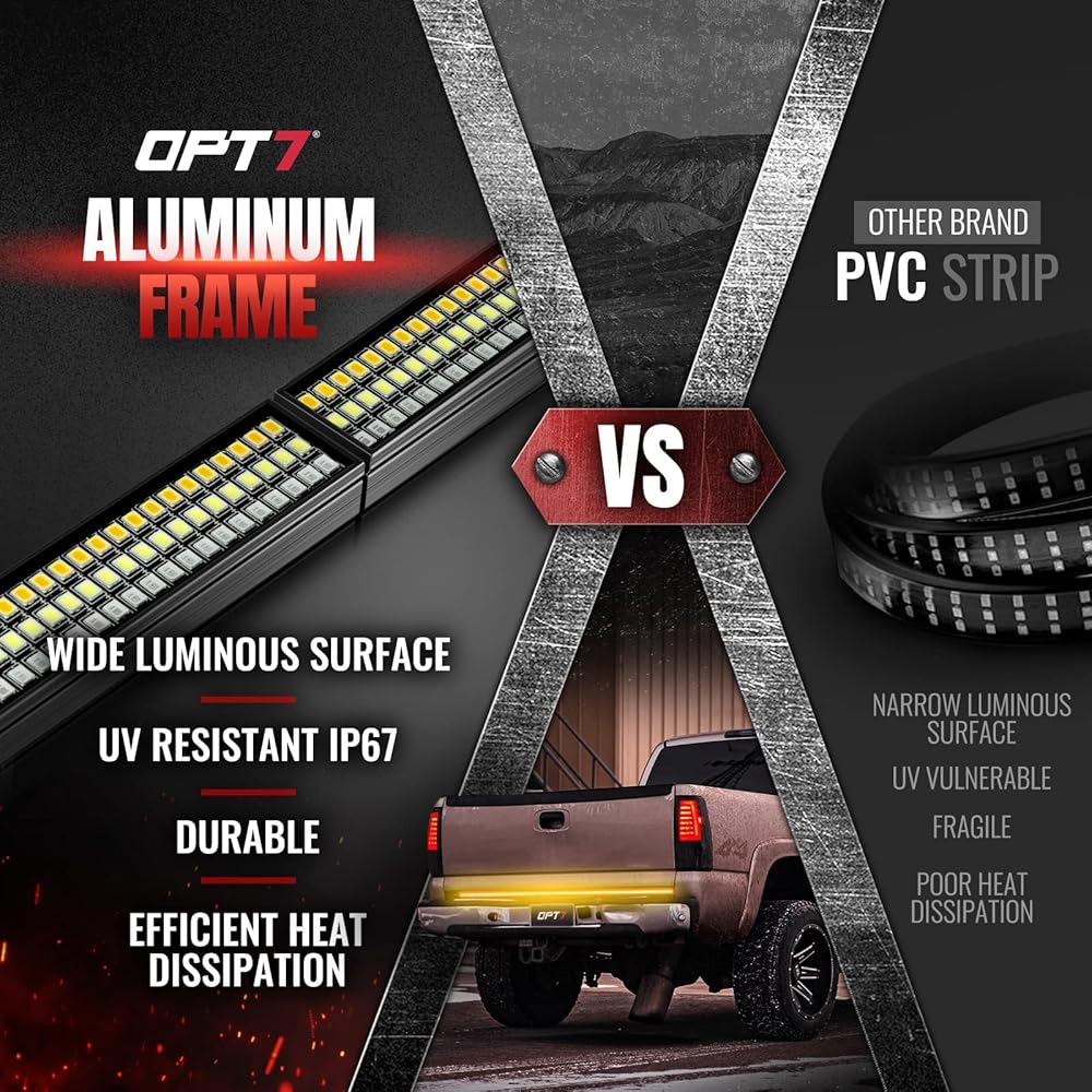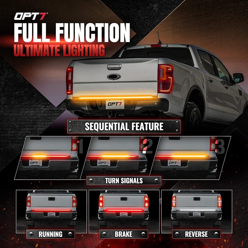 [ULTIMATE FEATURE] Integrated sequential turn signals. Redline Parlux Triple Truck Tailgate Light Bar offers 5 functions: running, turns, brake, reverse, and hazards. A total 1080 LED which is powerful & brighter, a higher density of LED that can make the light effect more smooth and noticeable.