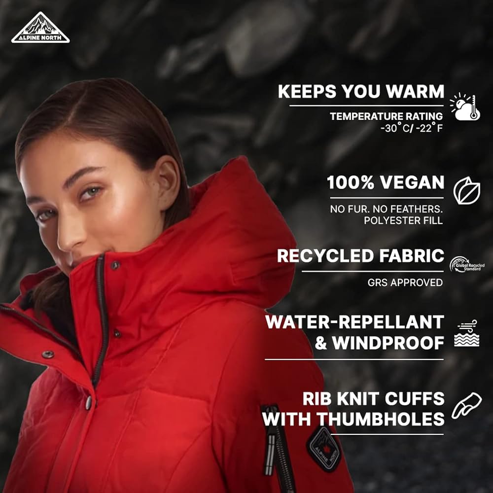 WOMEN'S INSULATED PARKA COAT - Windproof, water-resistant, and insulated with a beautifully fitted shape, there's no comparison to the Alpine North Women's Parka. Featuring vegan insulation, below-freezing protection, and a layerable fit, experience true protection against snow, slush, damp cold, and harsh winds without compromising on fashion.