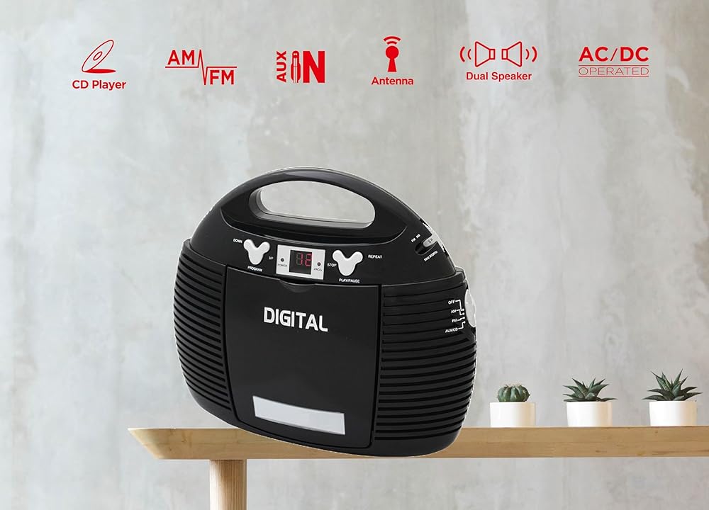 Vertical CD Player, AM/FM analog radio, Aux-in Jack for external audio devices, AC/DC dual power source.