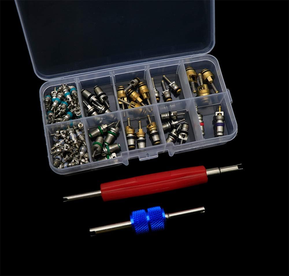 102 pcs assortments, including 100 values and 2 value core remover tool.