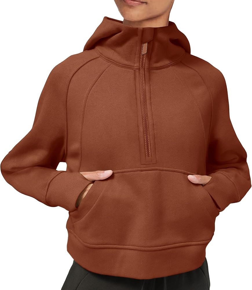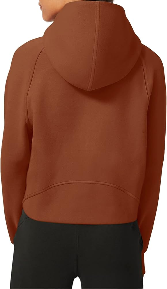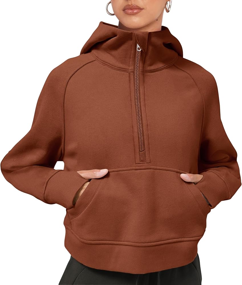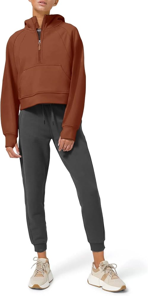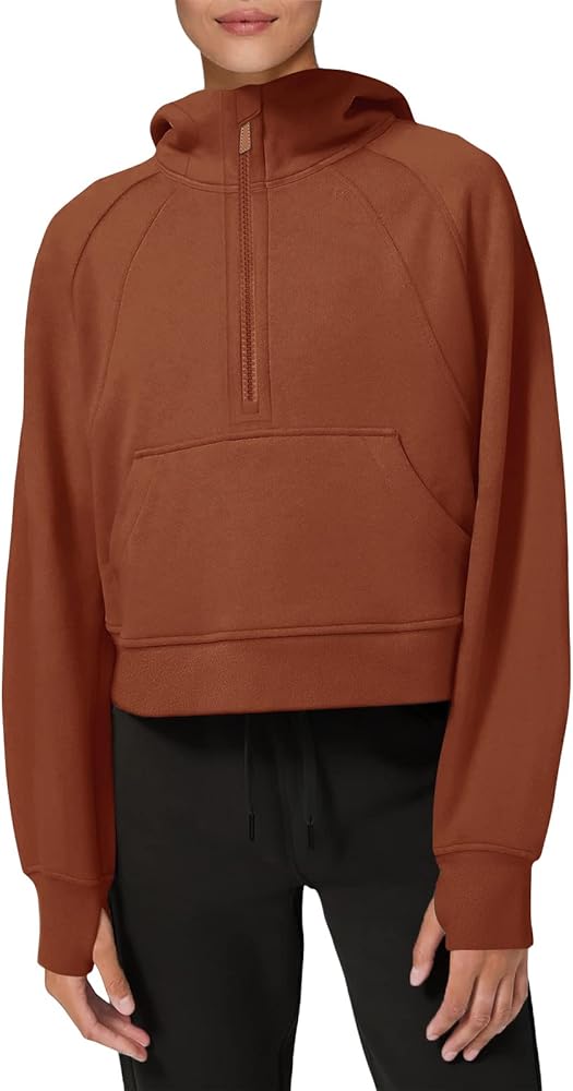 [FEATURES] - Athletic workout hoodies,women pullover sweatshirt,long sleeve with thumbhole ,1/2 zip up collar, solid color,cropped length,stand collar,fleece lined,kangaroo pockets,relaxed fit,crop top,with thumbholes.