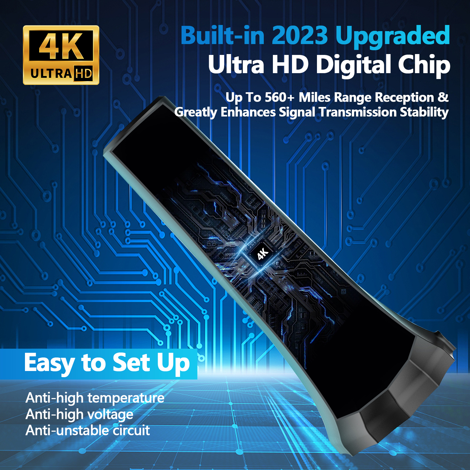 Magnetic Base and 360° Signal Reception - TV antenna for smart TVs is build in advanced 4K smart IC to provide 360° reception, ensuring a HD crystal clear picture no matter where it's installed in your home.With its magnetic base, installation is quick and easy. Simply attach it to any metal surface and start receiving TV signals in minutes.
