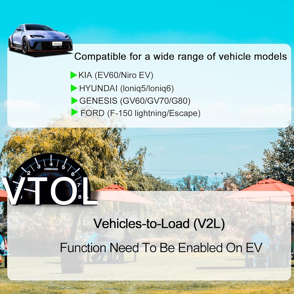 Easy to Use: Simply plug the V2L adapter into the port of the appropriate vehicle model (Hyundai Ioniq 5, Hyundai Ioniq 6, Kia EV6, Kia Niro EV, GENESIS GV60, GENESIS GV70, GENESIS G80, Ford F-150 Lightning, and Ford Escape PHEV cars.), and then plug the AC cable into the NEMA 5-20R socket at the back of the adapter.