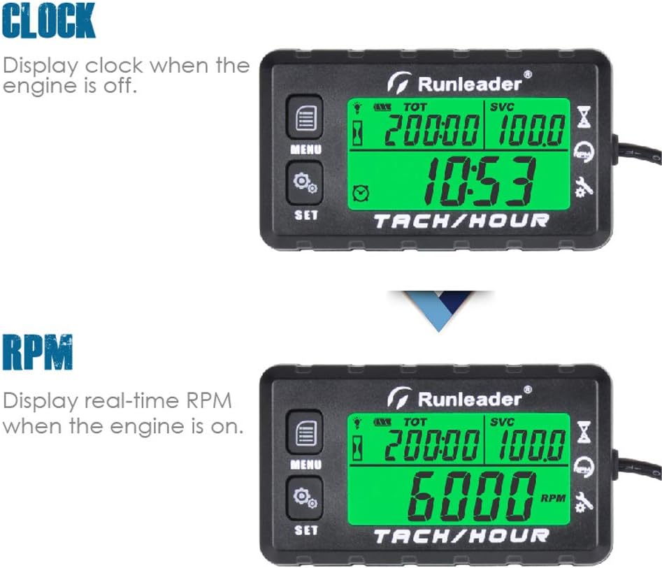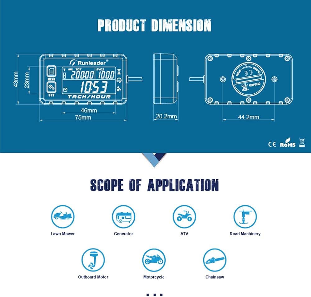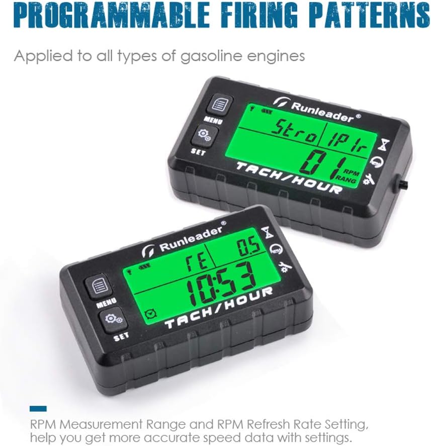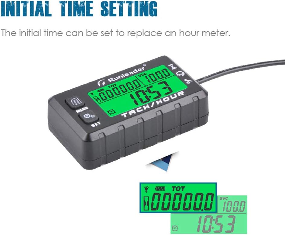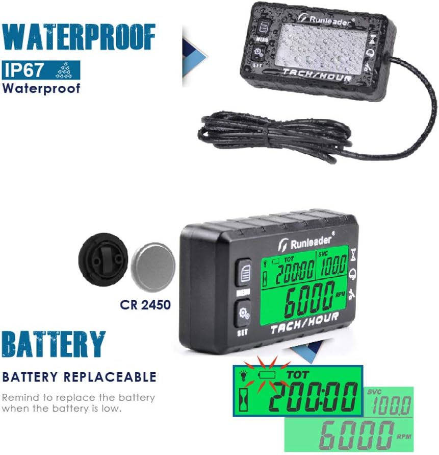 Inductive Tachometer Track Oil Change Hour Meter Backlit Digital Tach Hour Meter for 2 or 4 stroke gasoline engine maintenance timing and RPM detection, easy to install and operate.