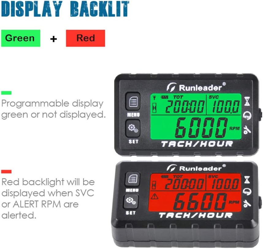 Programmable RPM alarm, red backlit display and warning icon flashing to remind the engine speed is out of range and tell your family that you need to come back safely