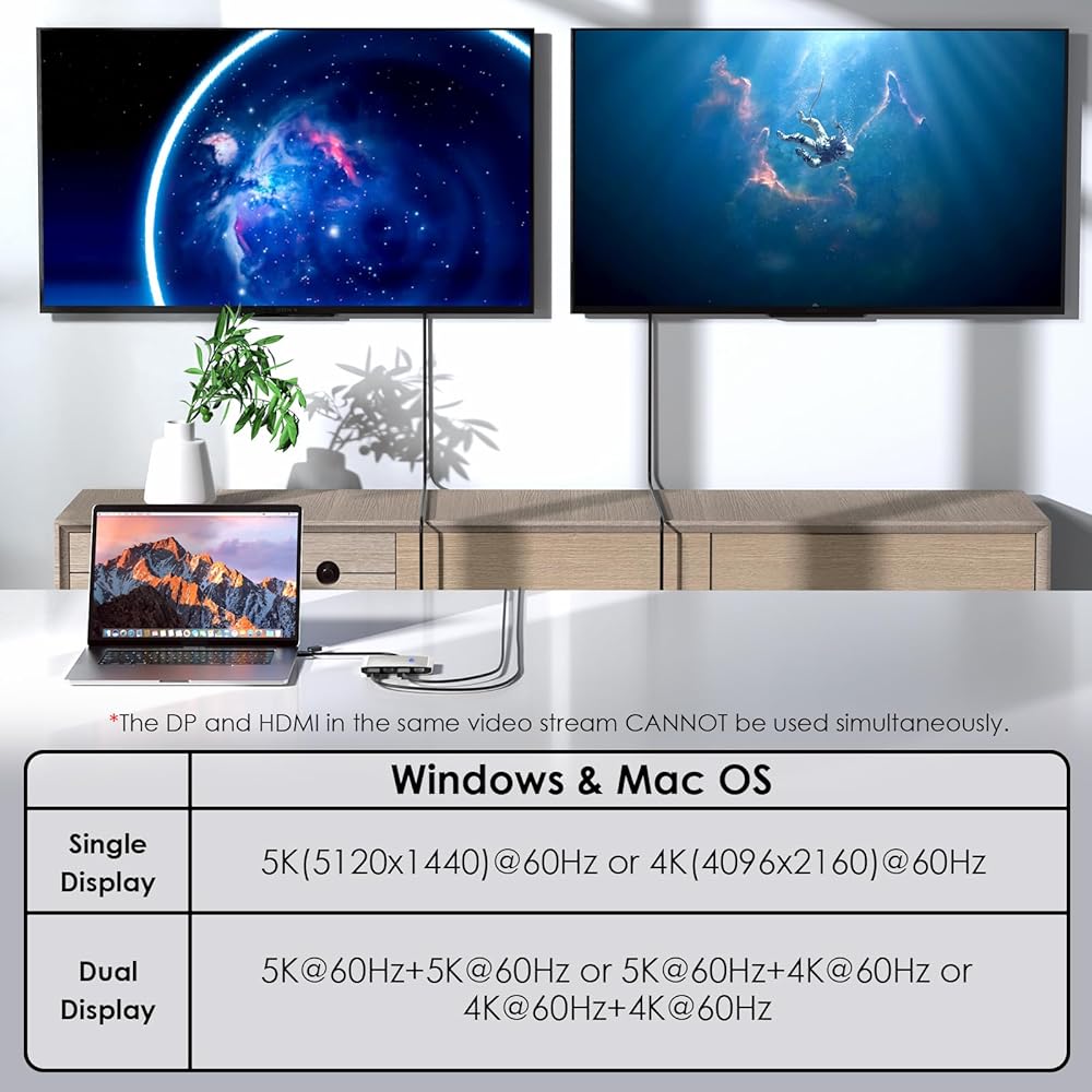 Up to Dual 4K@60Hz Displays:Equipped with dual DisplayPort and HDMI ports, this adapter allows you to experience the convenience of a dual-monitor setup with a single USB3.0 connection to the host device. Supporting dual resolutions up to 5120x1440@60Hz or 4096x2160@60Hz, you can enjoy crisp visuals on both displays.