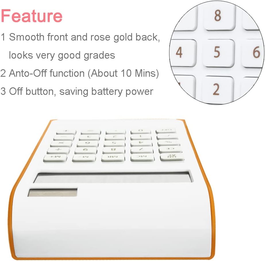 Nice Appearance - All themed to be rose gold and white/black, looks high class. 10 digits display, large numbers and the elevated top makes it easy to see the numbers. Sleek outside, big and sensitive keys for standard calculation , perfect for office, primary school, market or home use.