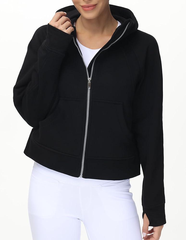 Fashionable Design. The Full-zip Collar design with thumb holes at the cuffs prevents the sleeves from moving freely, thus enhancing the warmth of the Women's Sweatshirts while keeping your hands warm. The length to the waist enhances the fit of the Sweatshirts without being too big or too small.
