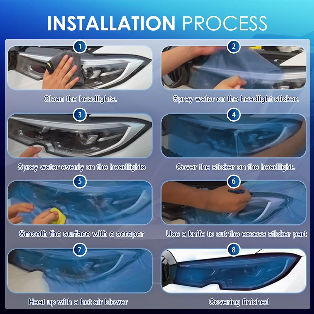 Installation Process:First, clean the lights thoroughly. Next, spray water on both the headlight sticker and the headlight itself, ensuring even coverage. Carefully place the sticker over the headlight. Use a scraper to smooth out the surface, eliminating any air bubbles. Then, trim any excess sticker material using a knife. Afterward, use a hot air blower to gently heat the area. Once heated, your headlight covering process is complete.