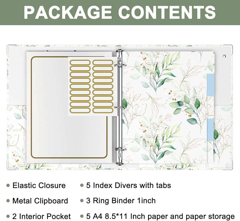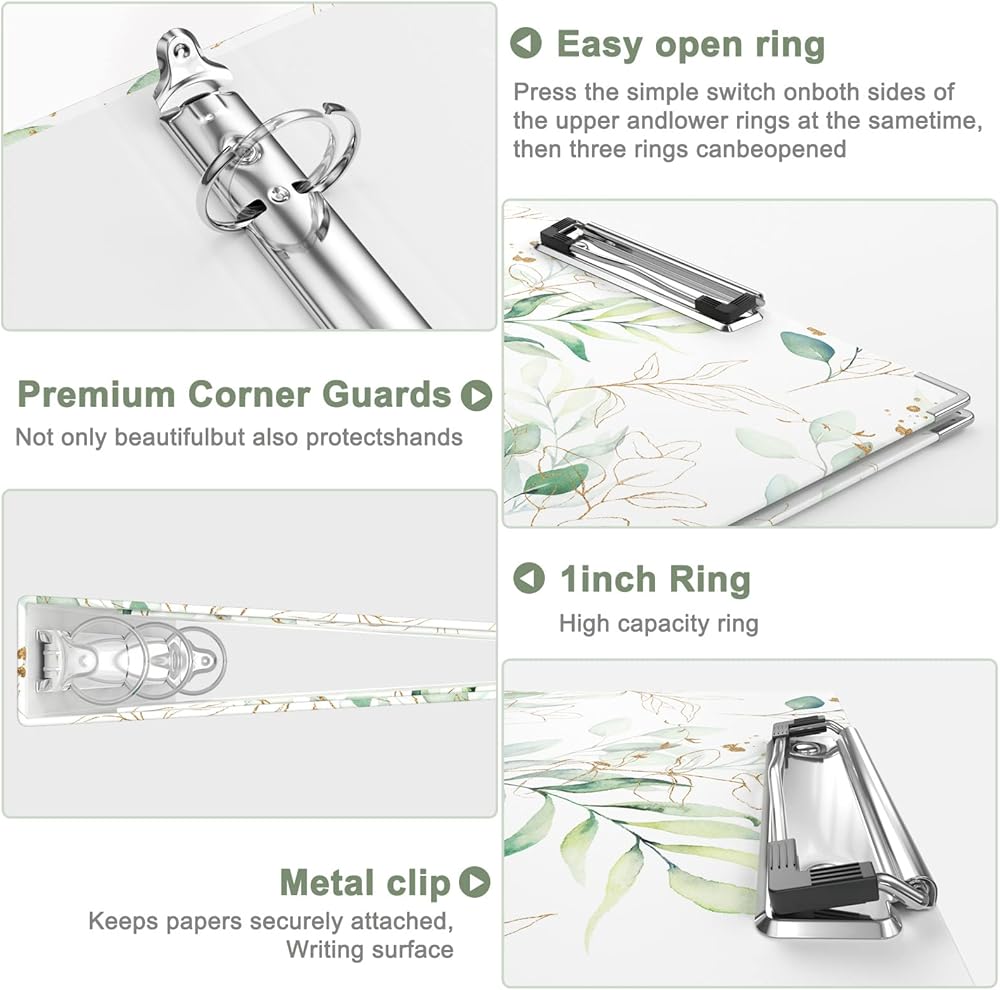 3 Ring Binder with clipboard, 1 inch Binder Organizer, 8.5" x 11" Letter Size View Binders with Dividers Tabs & Clear Sleeves, School Supplies, Office Supplies, Portfolio Binder, Leaves