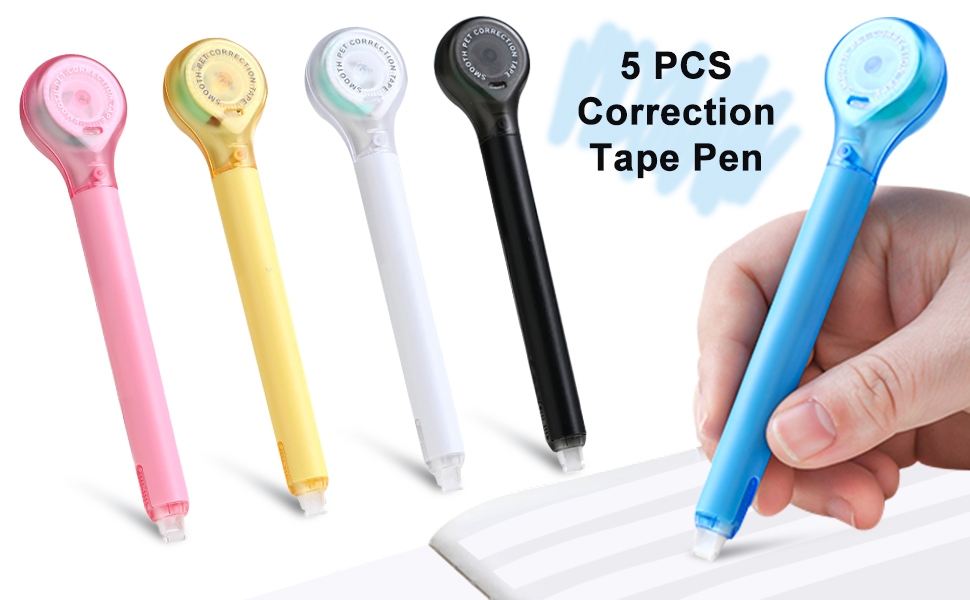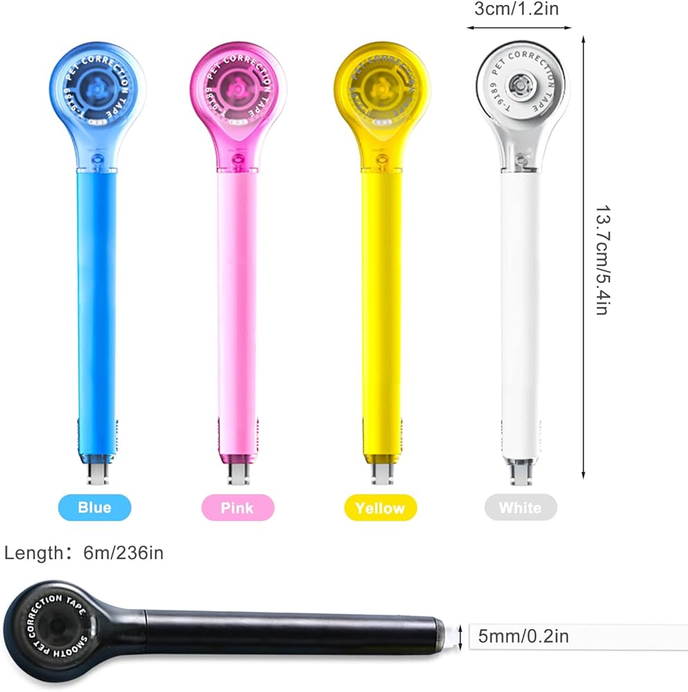 🤍【You Will Get】--5 pcs correction pen in 5 different colors. Size of each correction tape is 13.7*3cm/5.4*1.2in, the tape core is 5mm*6m/ 0.2*236in, total length of 30 m/1181in, enough for your daily use.