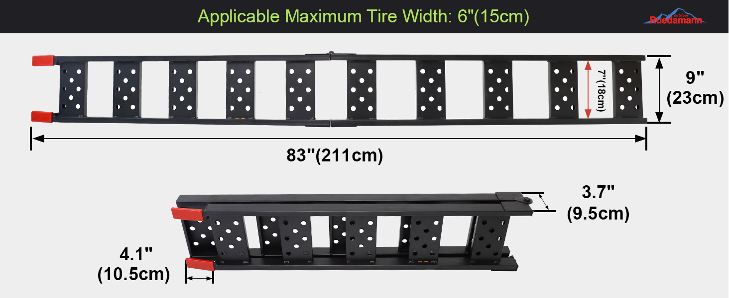 【Folding Ramp】Motorcycle Truck Ramp folding size is 42.1"L x 9"W x 3.7"H. Unfolding size is 83"L x 8.9" W x 1.6 "H inches. The weight is approximately 13.9LBS/PC. The foldable design of the ramp makes it easier to fit into the carriage and corner, does not occupy a lot of space. Recommended using height is below 23" (60cm).